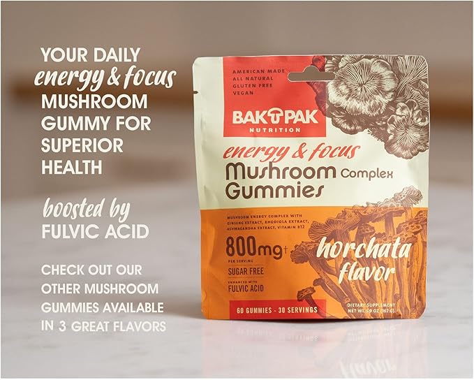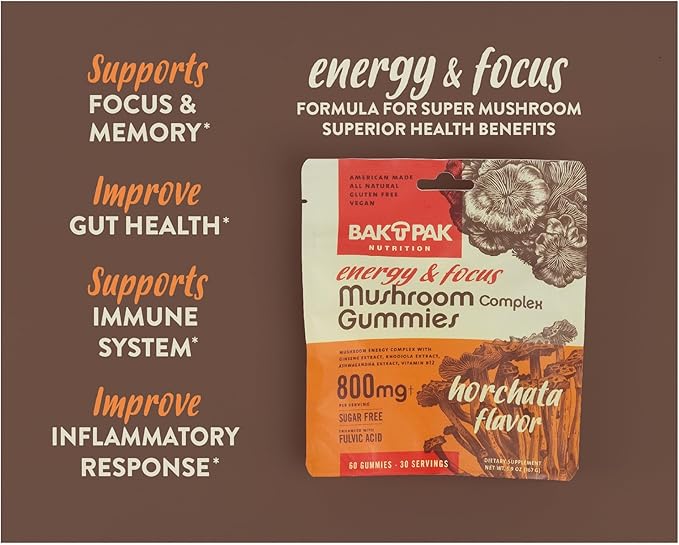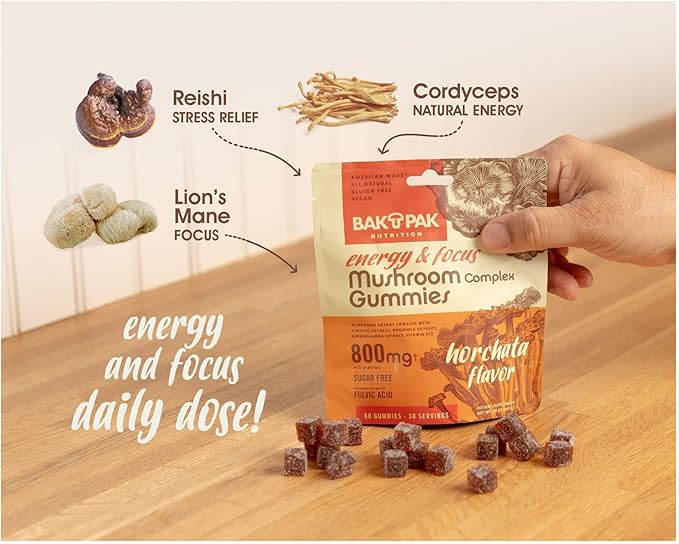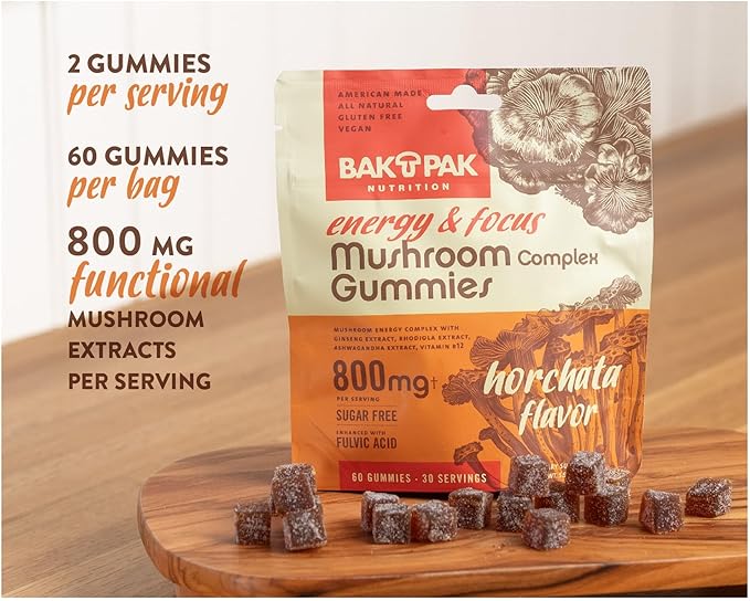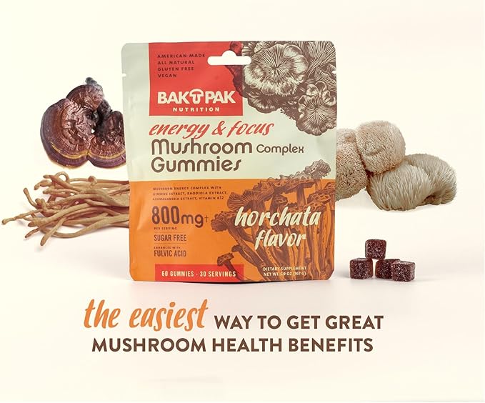 - Natural Energy Boost: Elevate your energy levels naturally with BakPak Nutrition's Mushroom Energy & Focus Gummies, featuring Cordyceps and Ginseng to help you power through your day without crashes.