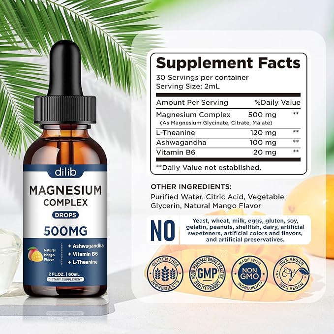 - STRESS RELIEF AND CALM: Formulated with Magnesium Glycinate 500mg Citrate, Malate L-Theanine, Ashwagandha and Vitamin B6, Dilib liquid magnesium glycinate supplement drops helps you manage occasional stress, release tension in your body and calm your mind and reduce migraine headaches and leg cramps. You may feel more relaxed during the day for work & study and more restful at night for better sleep