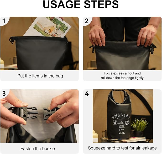 • SPACIOUS 20L DRY BAG: Easily store all your essentials with the PELLIOT 20L dry bag. Simply open the bag, load your items, roll the top down 3 to 5 times, and secure it with the buckle. The number of rolls controls the volume of the bag. Designed to protect your gear from water damage, it keep dry in wet conditions