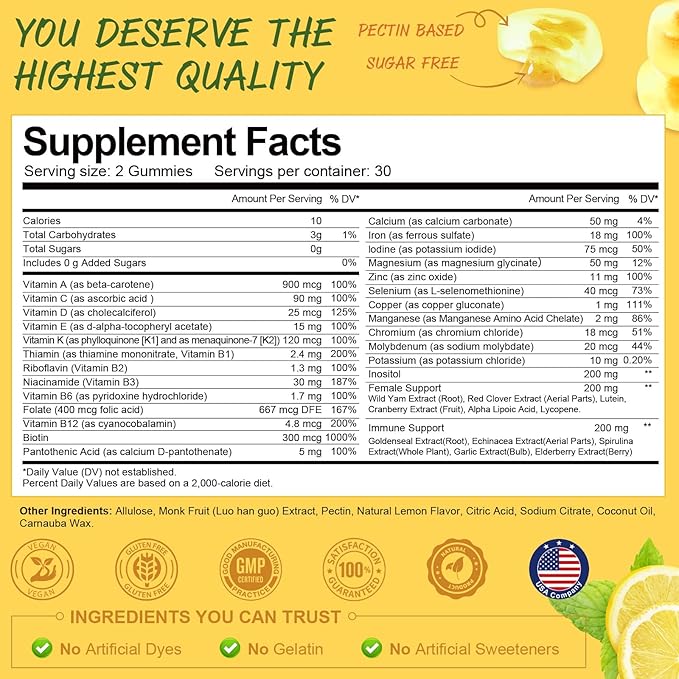 - Premium Guarantee: The delicious natural lemon flavor easily provides the beneficial nutrients you need in your busy life. Chew two gummies a day. Gluten-free and vegetarian, No dairy, wheat, peanut, or egg. VEGAN. If you have any questions, please contact us, your satisfaction is our TOP priority.