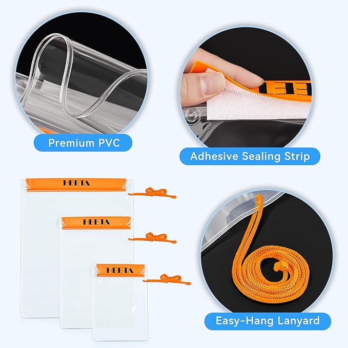 - Different Sizes: The waterproof bags with lanyard contain three sizes: Large: 15.9' x 10.6'; Medium: 12.4' x 7.1'; Small: 9' x 5.1'. You can choose different sizes according to your needs