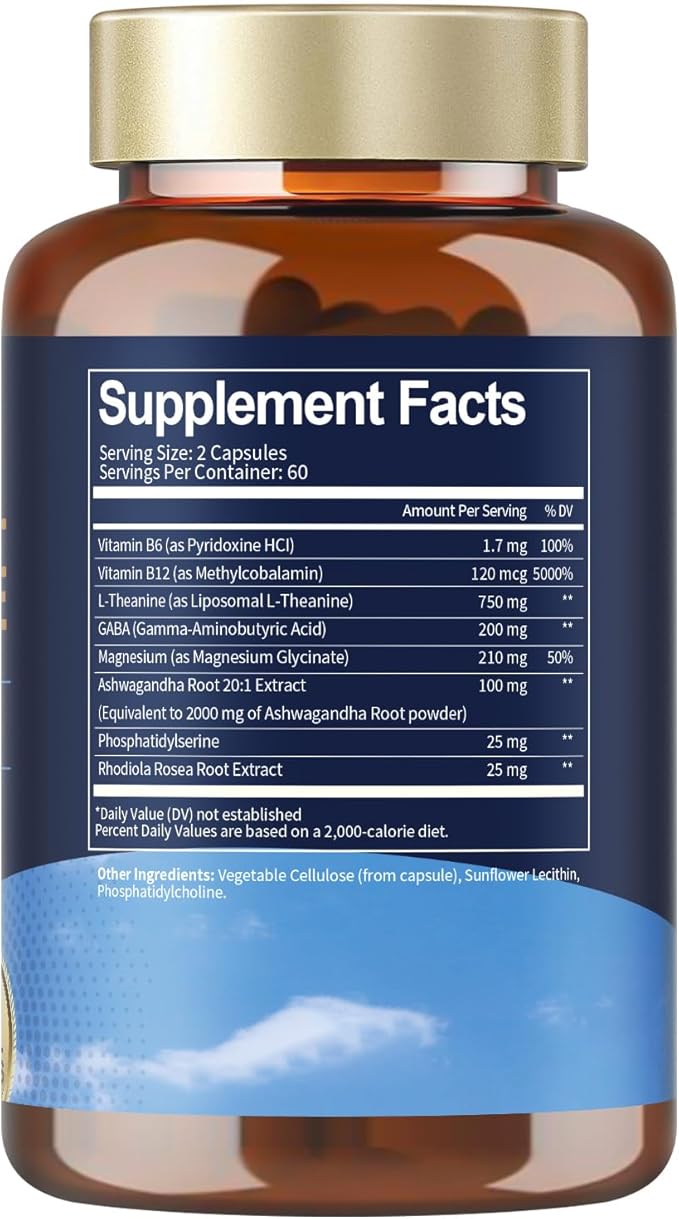 • Calm Your Mind, Boost Your Focus with a Synergistic Blend:Our formula combines L-Theanine with clinically studied ingredients like GABA, Ashwagandha, and Rhodiola Rosea to promote relaxation, and improve cognitive performance. Magnesium Glycinate and Phosphatidylserine further support a calm, focused mind.
