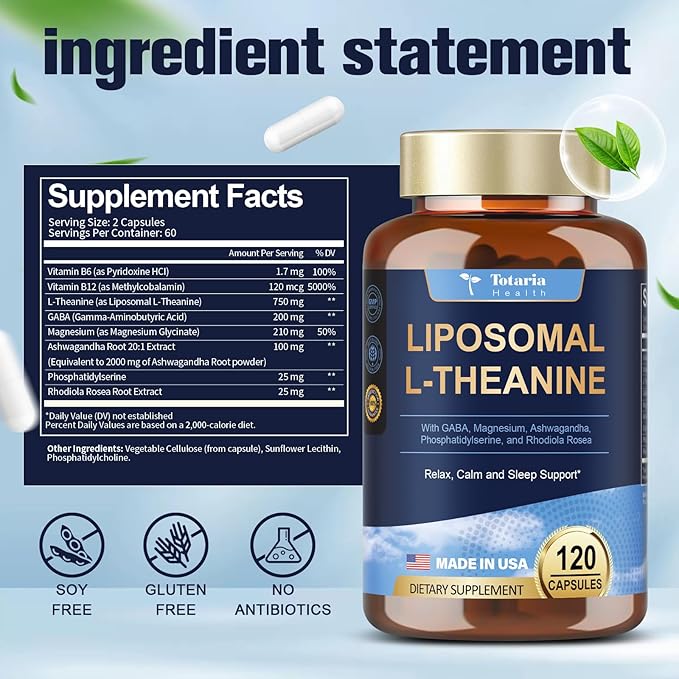 Liposomal L-Theanine Supplement 750mg with GABA,Ashwagandha,Magnesium Glycinate,Rhodiola Rosea,Phosphatidylserine Complex Supplements for Men and Women Mood |Focus | Sleep Support 120 Capsules