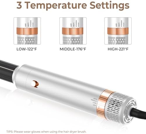 • [SAFETY FIRST] - We prioritize safety with an NTC feedback system, a bi-metal thermal switch, and an irreversible fuse. The hot air brush offers a quick cooling function by double-clicking the temperature button. Comes with heat-insulating gloves in case of burns. The air styler for hair curling with an Ergonomic button design, concentrated on the upper part of the body, prevents accidental clicks, also we added an ALCI plug to this hair-drying brush.