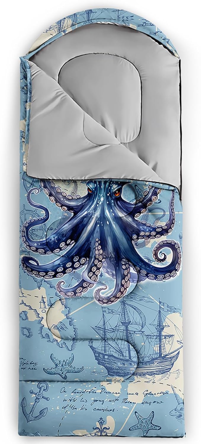 • Unique Octopus Design:This Octopus pattern sleeping bag is made of 3D digital printing with vibrant colors and patterns,size: 31W x 90L inches,temperature range: 32℉-77℉ (0℃-25℃),it also also have a weather resistant waterproof design to keep you warm and prevent you from any dampness,can be used in 3 seasons
