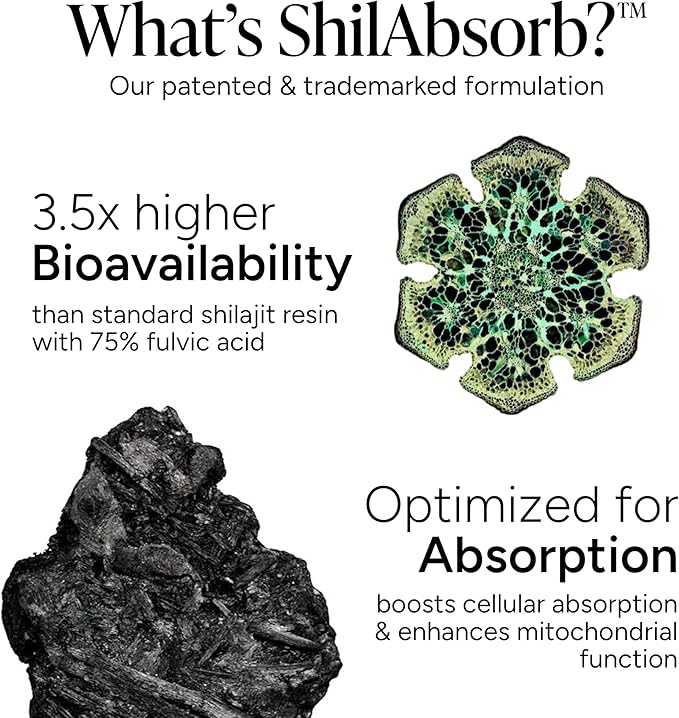 - π¬ 3.5X HIGHER BIOAVAILABILITY WITH ShilAbsorb Unlike standard Shilajit resin, our trademarked ShilAbsorb technology delivers 3.5X better absorption and over 75% fulvic acid, ensuring deeper cellular energy, vitality, and recovery.