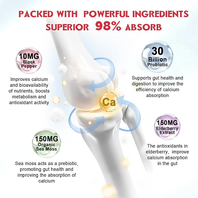 - Strengthen bones, teeth, and muscles: Calcium is essential for maintaining strong and healthy bones. Vitamin D3 ensures your body effectively absorbs calcium, directing it to your bones and teeth, while Vitamin K2 works synergistically with D3 to guide calcium to the right places—preventing buildup in arteries and soft tissues. Vitamin C boosts immunity and acts as an antioxidant, and we added Organic Sea Moss and Elder rich in natural vitamin minerals, Studies show seamoss calcium absorption up to 96%.