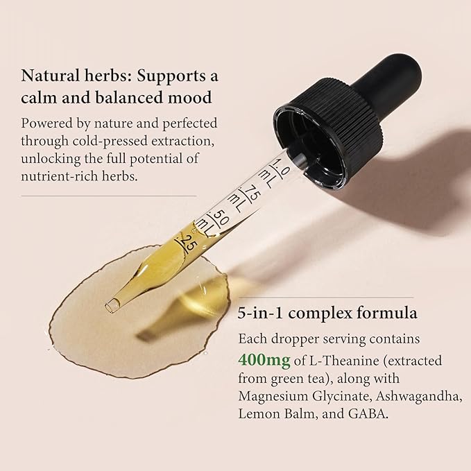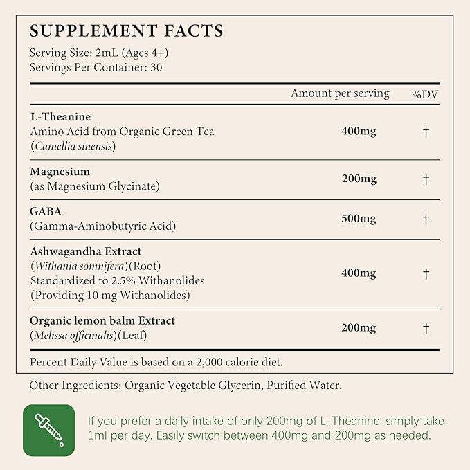 • L Theanine Liquid Drops: Our L-Theanine is extracted from high-quality organic green tea, delivering 400 mg per serving. Synergistically combined with GABA, magnesium glycinate, organic ashwagandha, and lemon balm, this formulation is designed to assist in maintaining emotional balance, cognitive sharpness, and sleep quality.