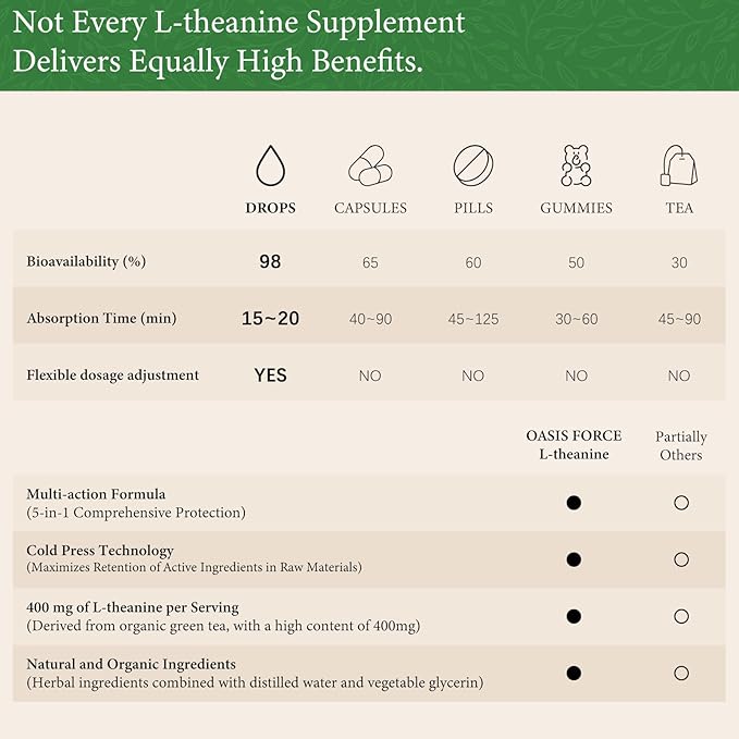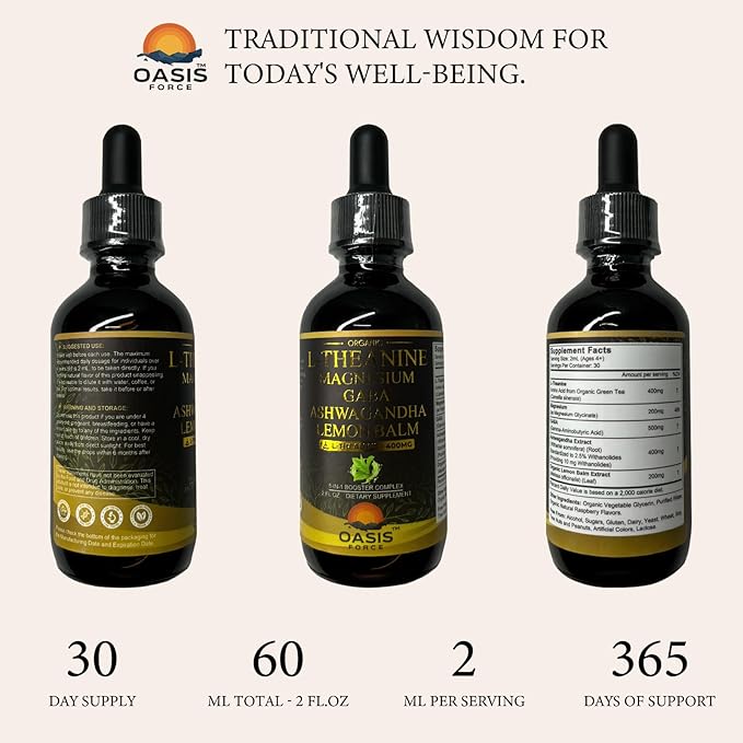 Oasisforce L Theanine 400mg Liquid Drops, L-Theanine Supplement for Adults & Kids with GABA, Magnesium & Ashwagandha, Natural Sleep, Focus & Relaxation Support, Vegan, Alcohol-Free, Non-GMO, 2 FL OZ