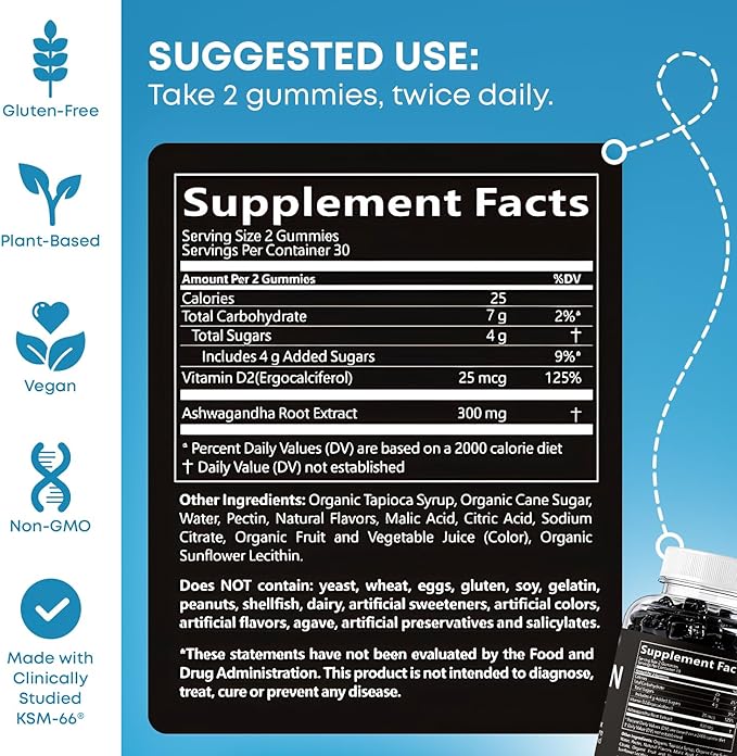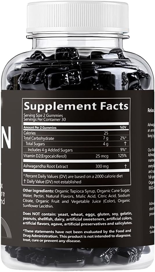 - Stress Relief & Relaxation: Contains 300mg of Ashwagandha root extract per serving (2 gummies) to help reduce stress and promote calmness.