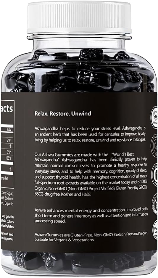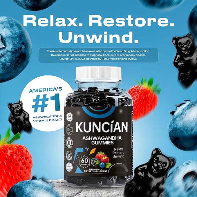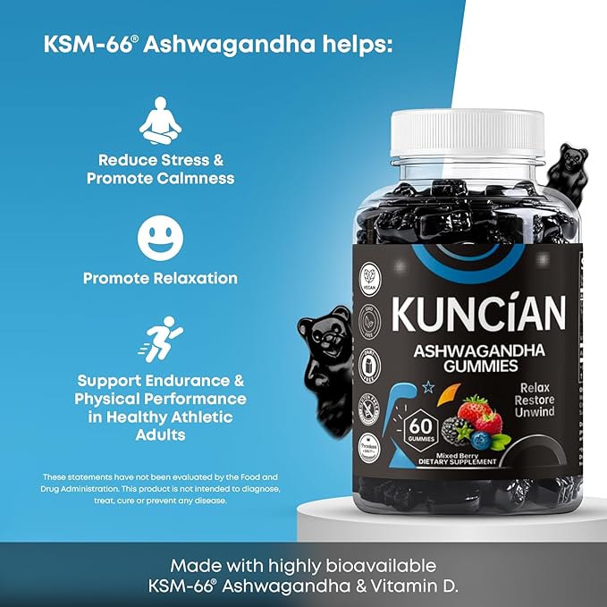 - Vegan, Non-GMO, Gluten-free & Gelatin-free: Each bottle of KUNCIAN Ashwagandha contains 60 delicious vegan, non-gmo, gluten-free & gelatin free Ashwa gummies.