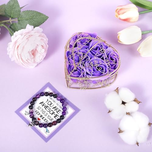 - 🎁【16PCS SELF CARE GIFTS FOR WOMEN】Still looking for a luxury gift baskets for women to offers an unforgettable unboxing experience? HAPFRJIN unique birthday box for woman contains all carefully designed lavender items, come with gift card, lavender bath bomb, diamond handmade bath soap, coral velvet bear towel, plush fuzzy socks, handmade crochet gifts, purple agate stretch rope bracelet, lavender scented bath salt, silk eye mask, straw, 40 0z insulated tumbler, exquisite gift box,scrunchies, lavender shower tablets rose shower tablets, 4oz scented candle, flannel blanket,floral soap.