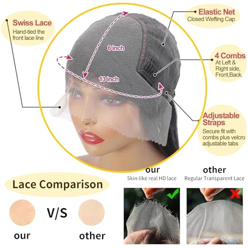 - 【13x6 Lace Front Wigs Human Hair Detail Features】:13x6 full frontal lace can make any part, big lace frontal nude see through transparent invisible soft thin lace melt easily. Pre-plucked hairline with baby hair around the perimeter, giving you a natural-looking hairline and a full, thick, neat appearance.