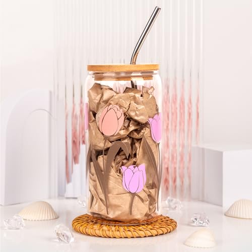 • TULIPS DESIGN ICED COFFEE CUP: Brighten your lady's day with our glass cup featuring a line floral print, perfect for those who cherish a splash of joy and nature in their everyday routine. This tumbler is crafted from high borosilicate glass(Dishwasher safety design), which withstands rapid temperature shifts. It features a natural bamboo lid that enhances the drinking experience.