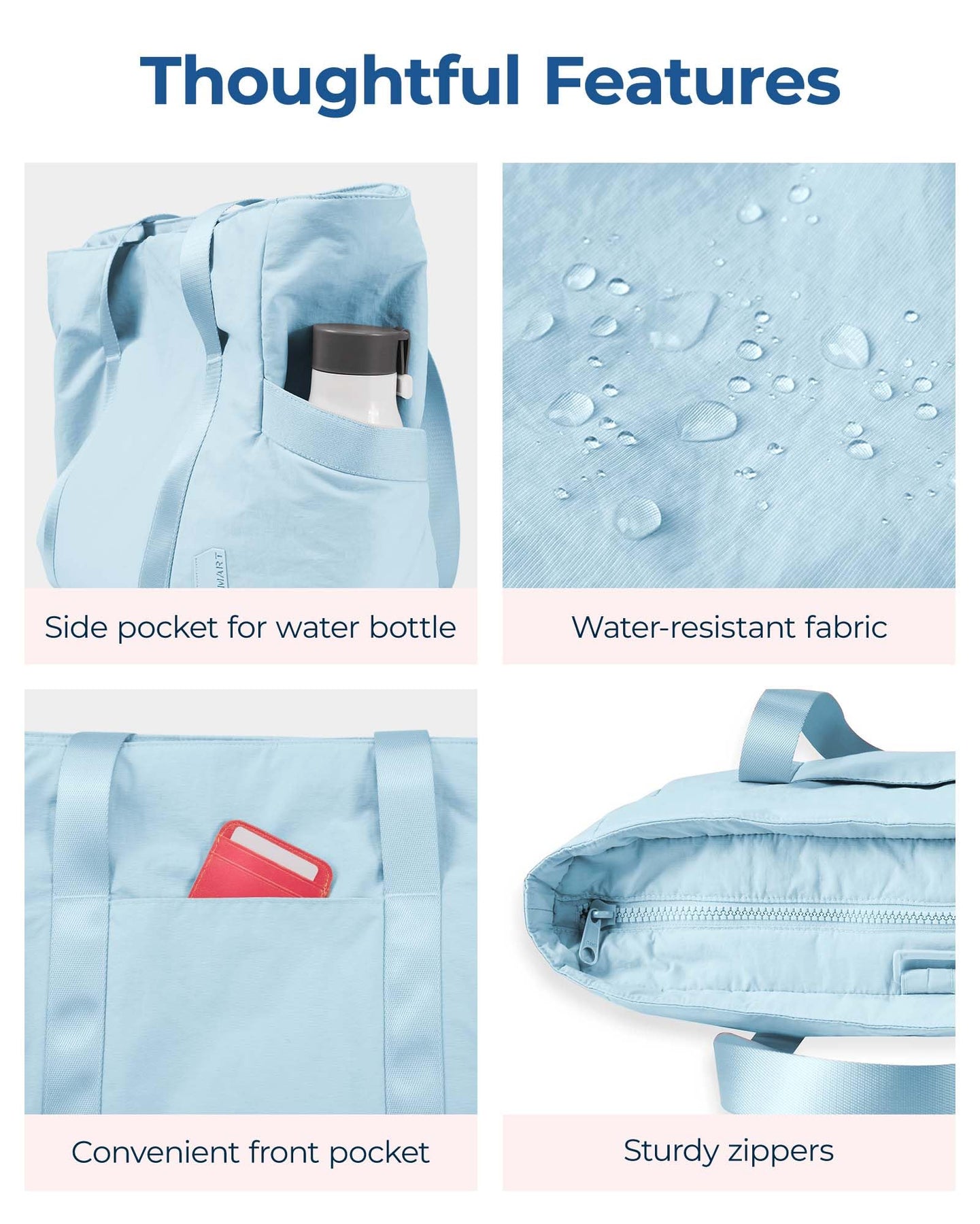 • Large Capacity: Spacious compartment can hold your clothes, cosmetics, documents and other items you need. Side easy access pockets for your water bottle, umbrella, etc