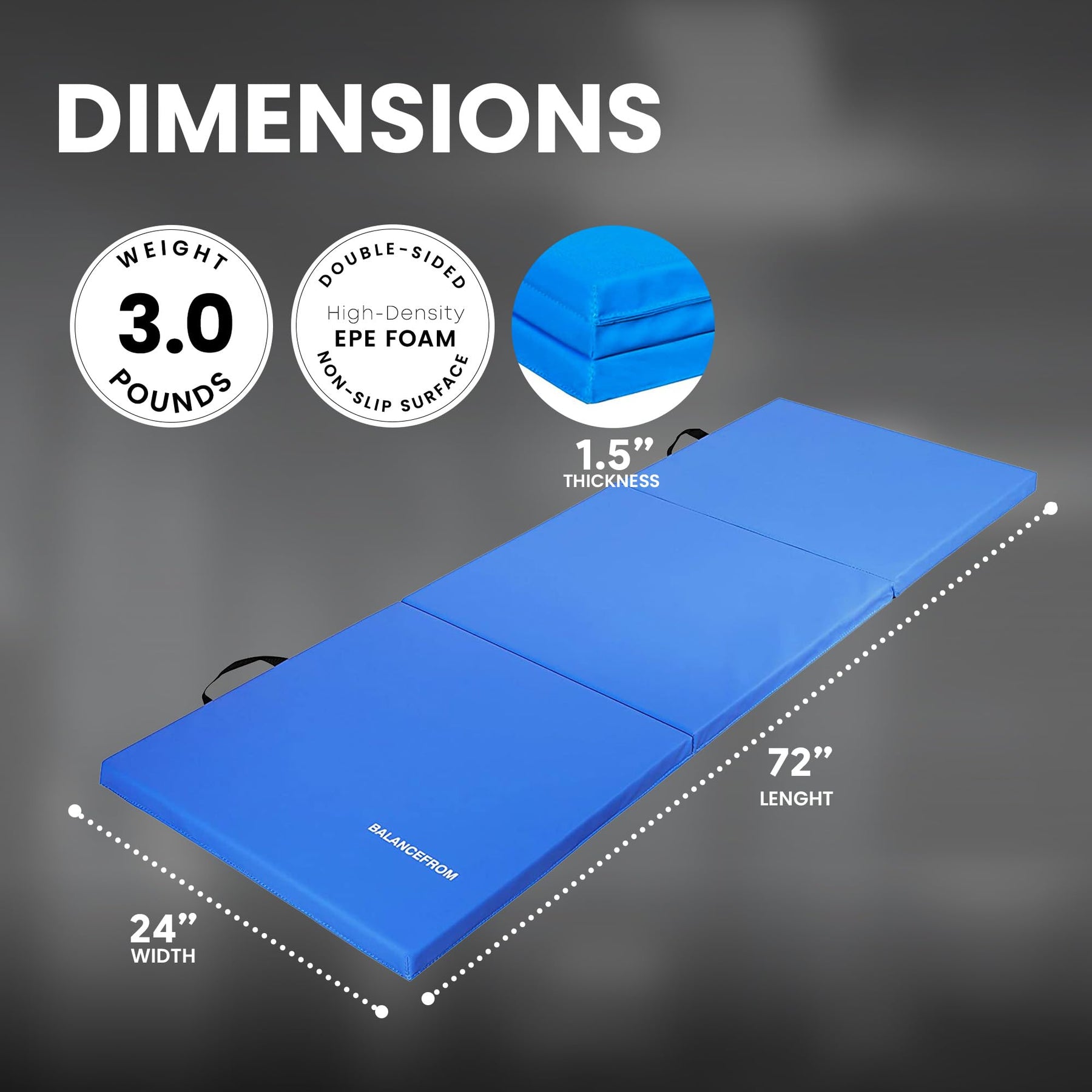 Details: BalanceFrom 1.5' Thick Three Fold Folding Exercise Mat with Carrying Handles for MMA, Gymnastics and Home Gym Protective Flooring (Blue)