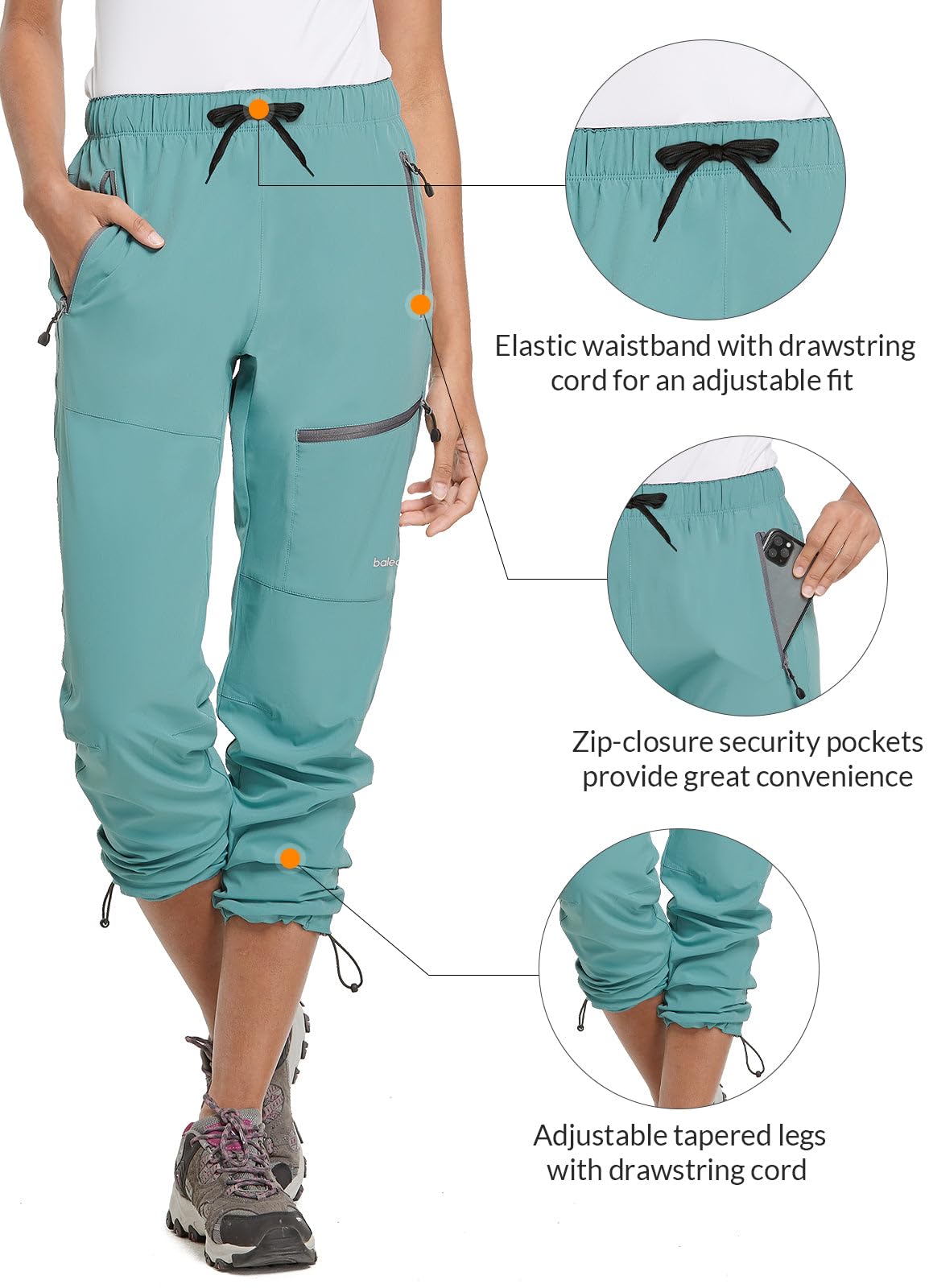 Details: The Baleaf Women's Athletic Capris Pants combining comfort, great fit and versatility was made for the outdoor-loving woman. Crafted of water-Resistant, stretch and quick-dry fabric, our hiking Cargo capris remain lightweight, yet durable to keep you cool and comfortable overtime. The baleaf hiking pants built-in Ultraviolet Protection Factor (UPF) 50 protect you from the sun's harmful rays. Features Stretch fabric - 90 % Polyester, 10% spandex Fabric rating UPF 50+ helps you stay safe in the sun Gusseted crotch and 4-way stretch construction enhance movement and comfort Machine washable