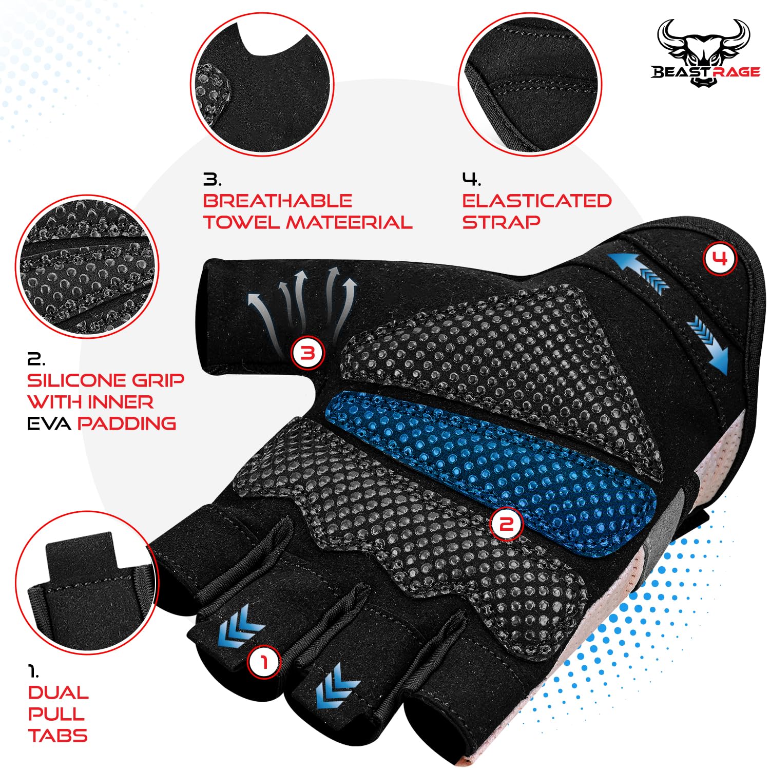 Sweat-removing thumb panel made of absorbent terry cloth. Ideal for majority of fitness requirements use firm grips when exercising in the gym. Bulgar bag lifting or a 25 lb kettlebell together with black fingerless gloves when performing intense exercise such as lifting weights at gym, remember to breathe more ventilation and less perspiration equal no odor fitness instructors recommend wearing gloves when deadlifting to avoid injuries to your palms.