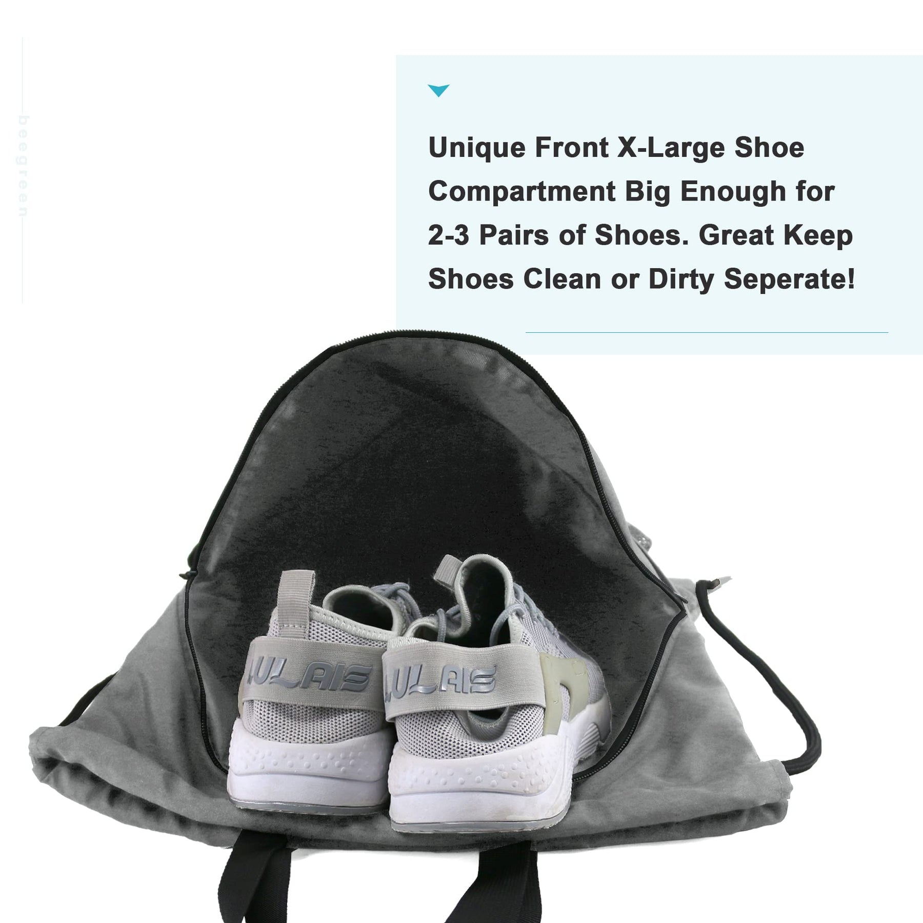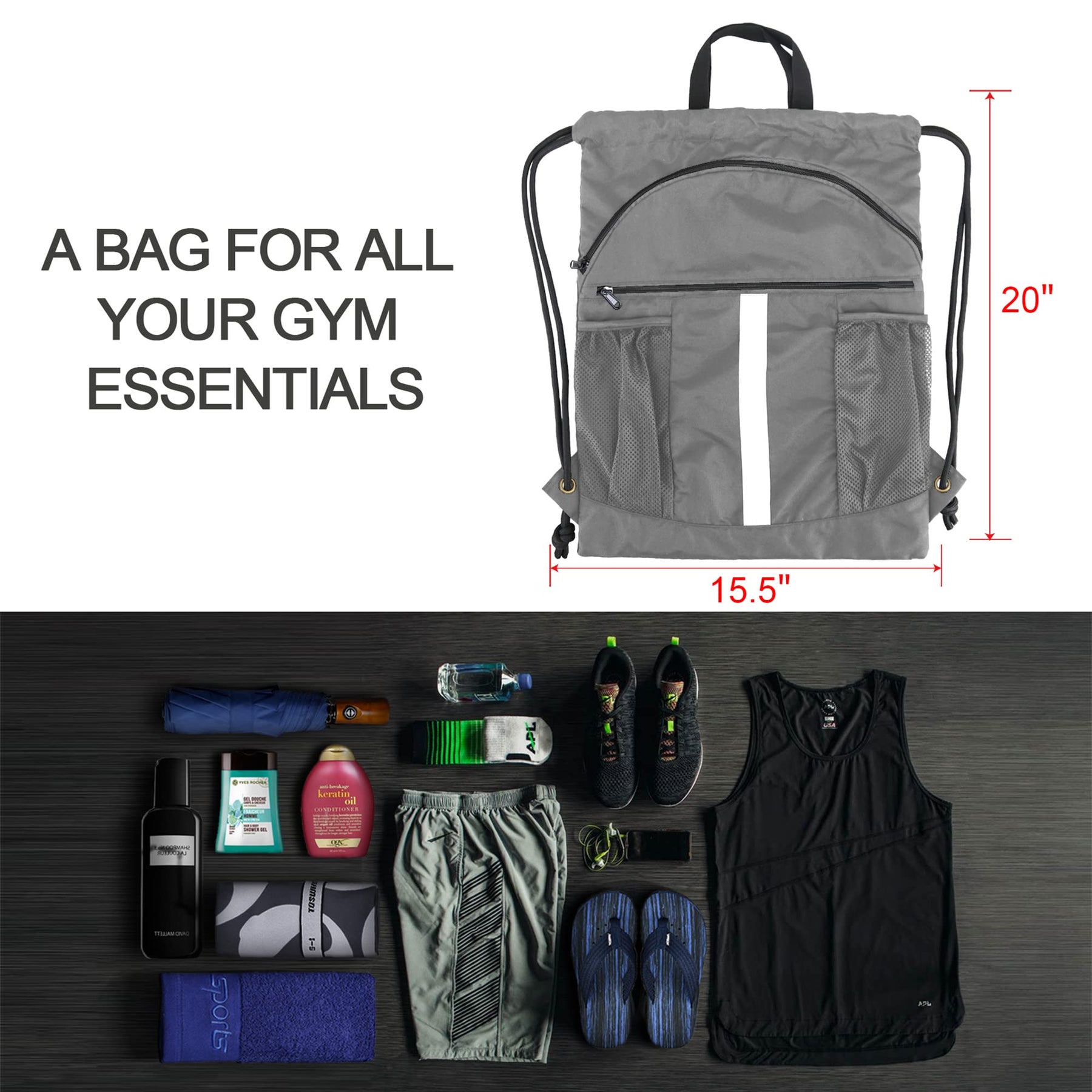 - Convenient Multi Pockets: The big shoe compartment in front of draw string sport bag can hold two pairs of shoes; the smaller zipper front pocket is perfect for keeping an ipad, towel, and other items, besides, two sides mesh bags allow you to place a water bottle, umbrella easily. Inside of cinch bag, the zipper pocket can hold small valuables such as wallet, cellphone, keys and so on. Multiple Pockets help you to keep things to be placed by category, easy to be found.
