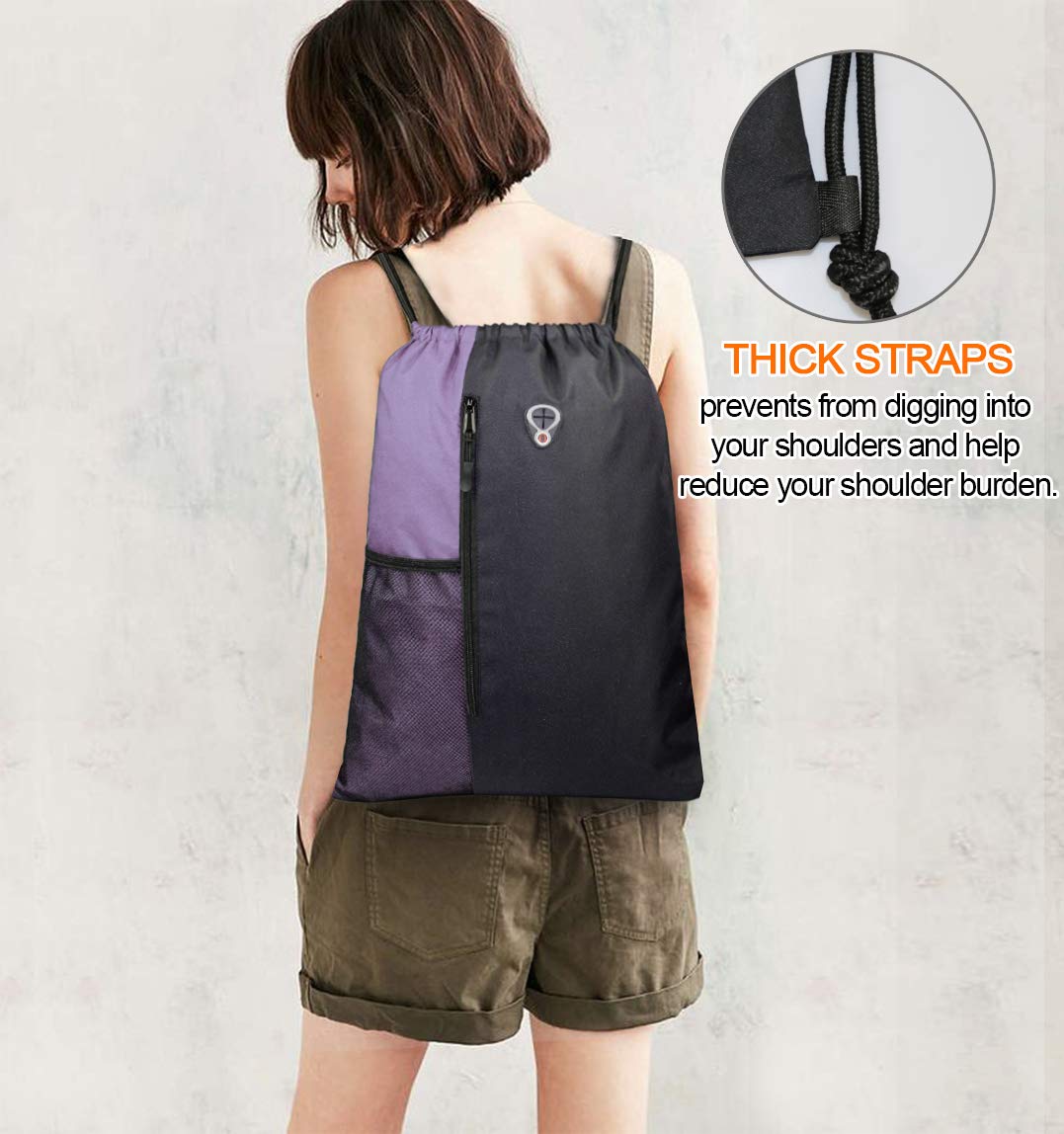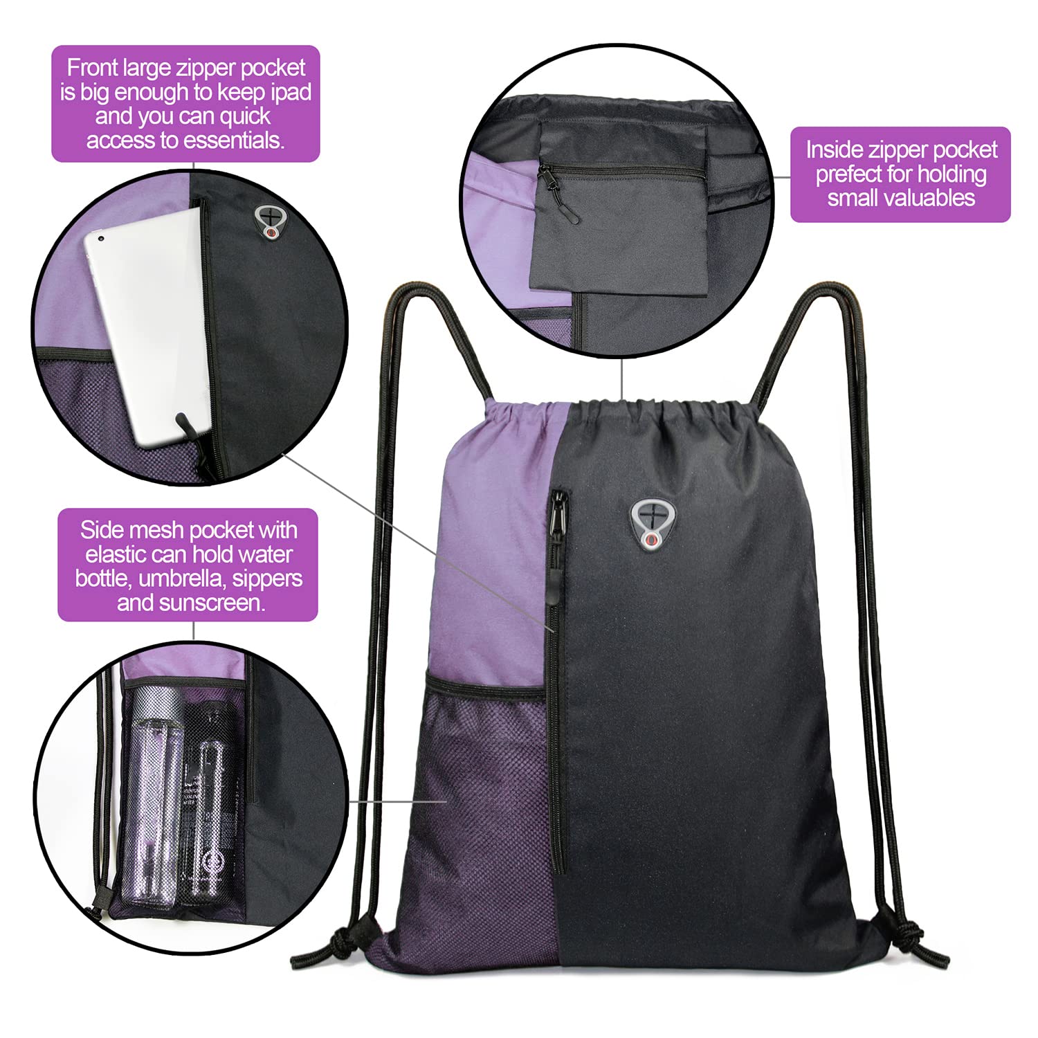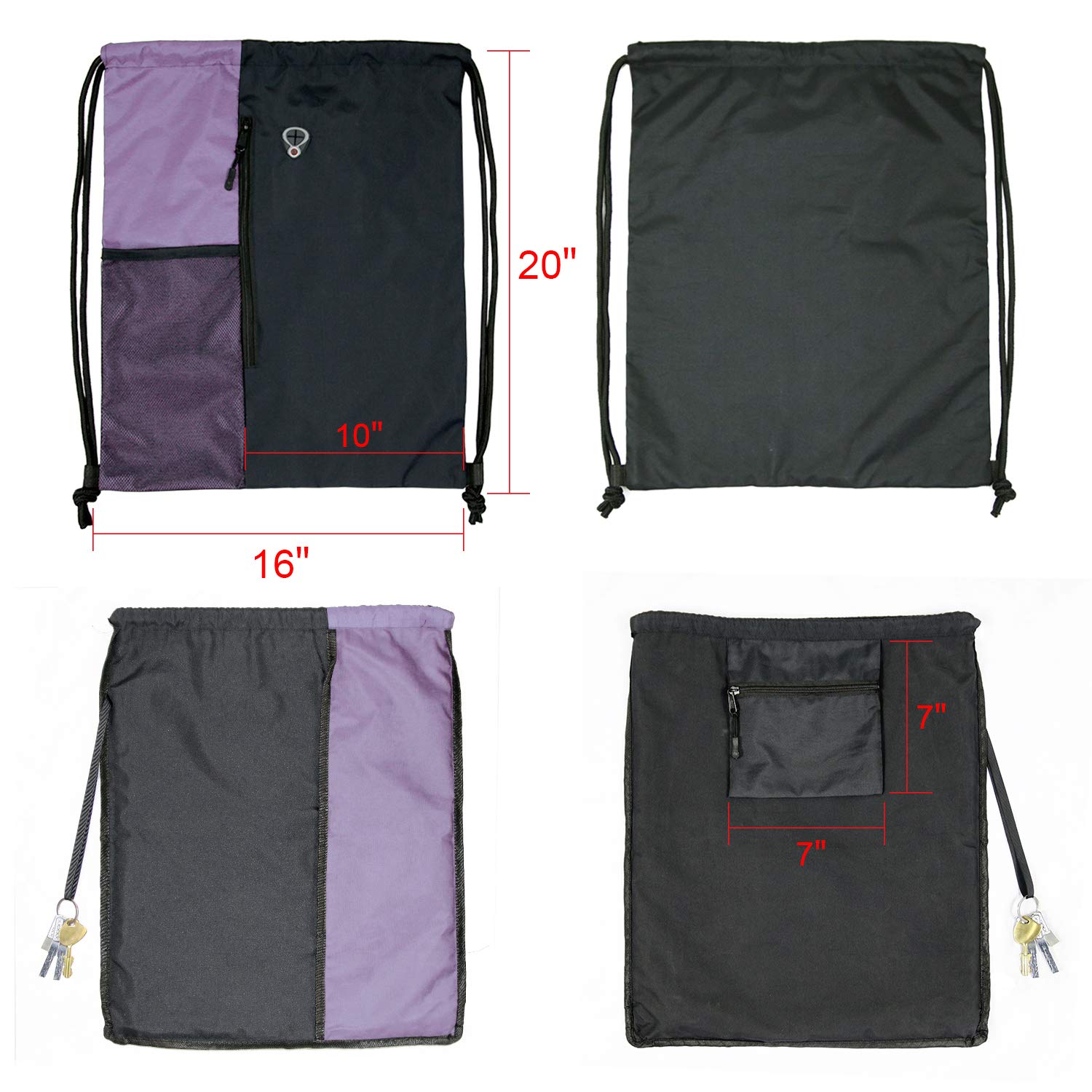 - CONVENIENT MULTI POCKETS: 20' tall full length and 10' width front large zipper pocket is perfect for keeping odds & ends handy without digging through the entire athletic bags. An extra inside zipper pocket measures 7 ' x 7', big enough for holding small valuables such as sports watch, wallet, cellphone to prevent any pickpockets. Another Side mesh pocket with elastic on the front of the string backpack can hold the water bottle, umbrella, sippers, and sunscreen.