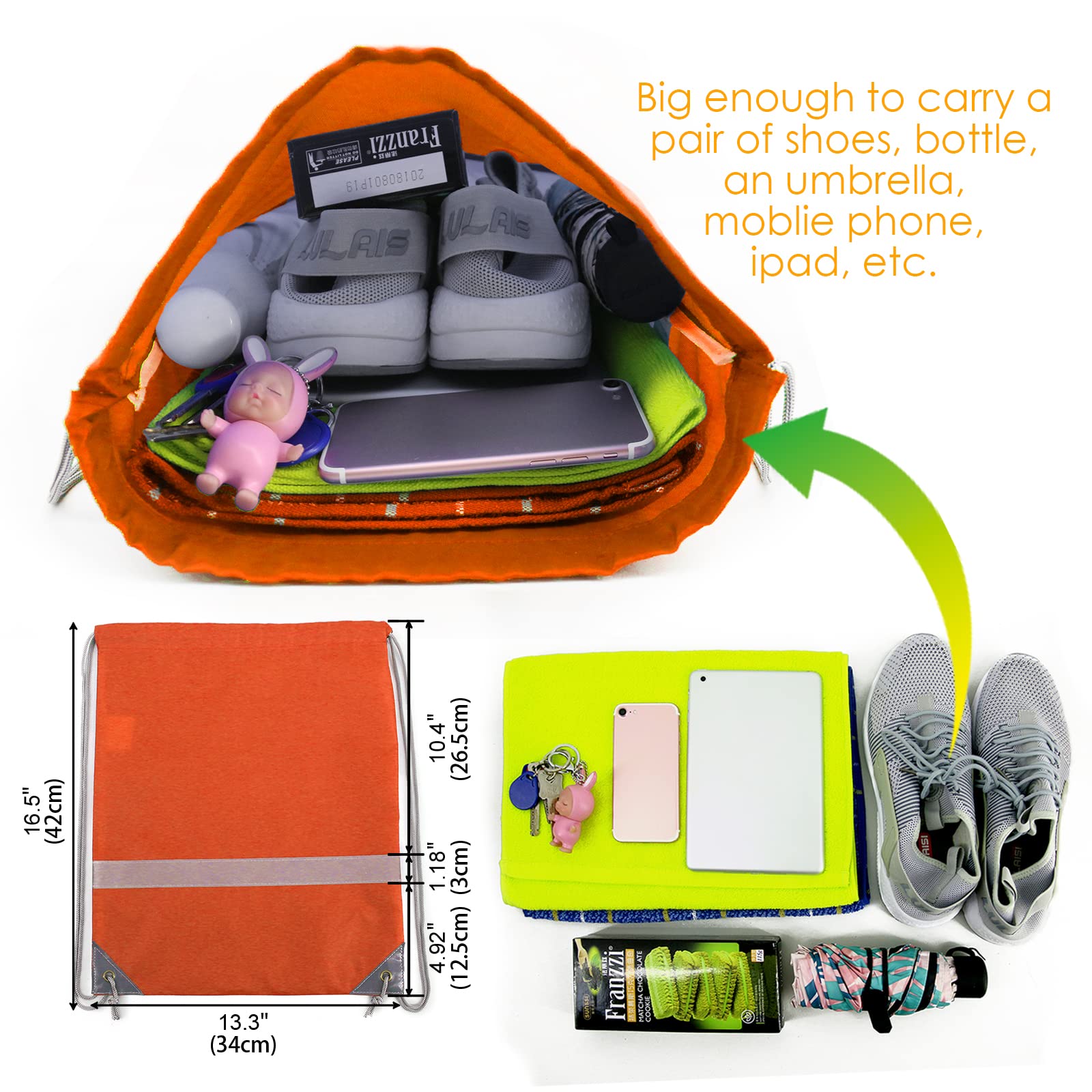 - 【PERFECT SIZE】: The drawstring backpack measures 16.5'x13.4', it is big enough to carry a pair of shoes, a bottle, an umbrella, lunch, or clothing. Idea gifts for a birthday party, construction giveaways, sporting promotions, fair prizes, camping, hiking, travel, shopping, theme parks, cabin trip, gym, beaches, and more.