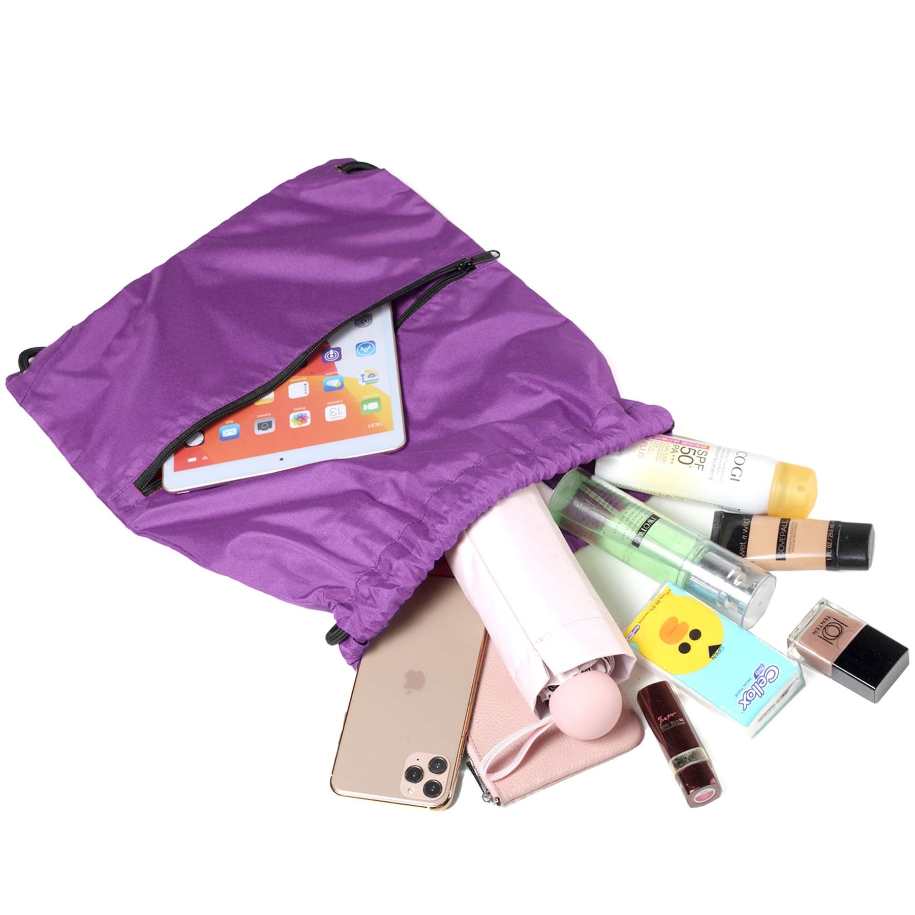 - 【2 Zippered Pockets & Large Capacity】:The size of our string bag is 18.5 'x 13.8'. with 3 functional compartments; 1 main large compartment with drawstring closure fits with towels, hat ,and it is big enough to hold a basketball. The inner zippered pouch of our sports bag can store important items such as cell phone, keys, and wallet , avoidting items from falling. Another front zippered pocket is more suitable for commonly used items such as sunscreen, glasses, lipstick and more.