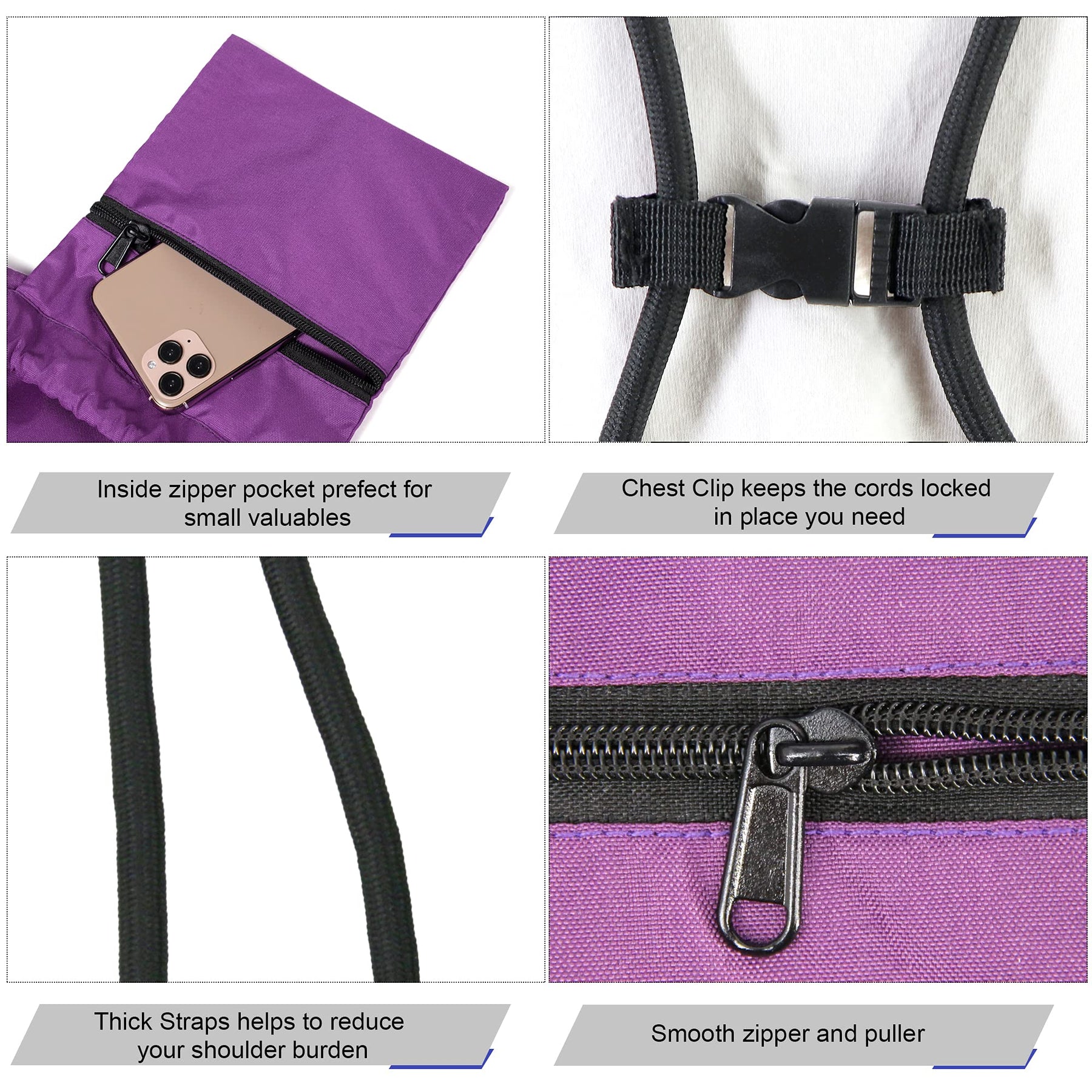 Details: Drawstring Closure Design: The adjustable drawstring bring you comfort which prevent digging into your shoulders and help reduce your shoulder burden. Drawstring closure allows you to take things quickly from our string bag. Multi-purpose: Our sport bag is perfect for for gym, sport, yoga, dance, travel, carry-on, luggage, camping, training and more activities! Enhanced Durability: Double stitches for all seams. The string knot areas are especially reinforced,the both corners are triple reinforced. The bronzed grommets on this drawstring bags are very well reinforced by fabric. The draw string bag is very strong and durable! Easy on/off Rope Buckles: Our cinch bag comes with a rope buckle keep cords secure & in place and never slide off your shoulders. Also, it could adjust the length of the drawstrings to bring you comfort.