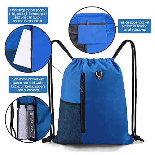 - CONVENIENT MULTI POCKETS: 20' tall full length and 10' width front large zipper pocket is perfect for keeping odds & ends handy without digging through the entire athletic bags. An extra inside zipper pocket measures 7 ' x 7', big enough for holding small valuables such as sports watch, wallet, cellphone to avoid any pickpockets. Another Side mesh pocket with elastic on the front of gym drawstring backpack can hold the water bottle, umbrella, sippers, and sunscreen.