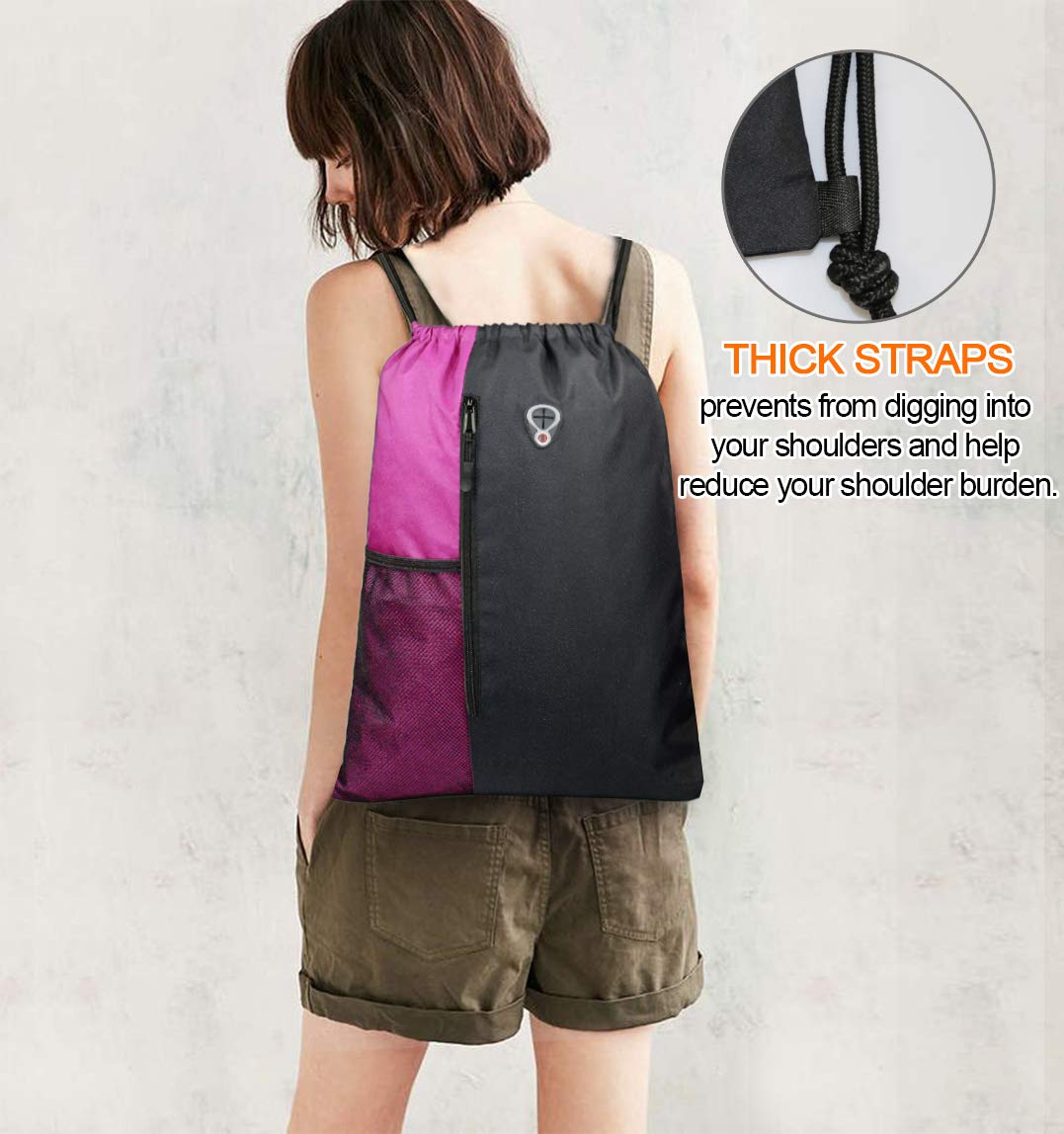 - CONVENIENT MULTI POCKETS: 20' tall full length and 10' width front large zipper pocket is perfect for keeping odds & ends handy without digging through the entire athletic bags. An extra inside zipper pocket measures 7 ' x 7', big enough for holding small valuables such as sports watch, wallet, cellphone to avoid any pickpockets. Another Side mesh pocket with elastic on the front of the string backpack can hold the water bottle, umbrella, sippers, and sunscreen.