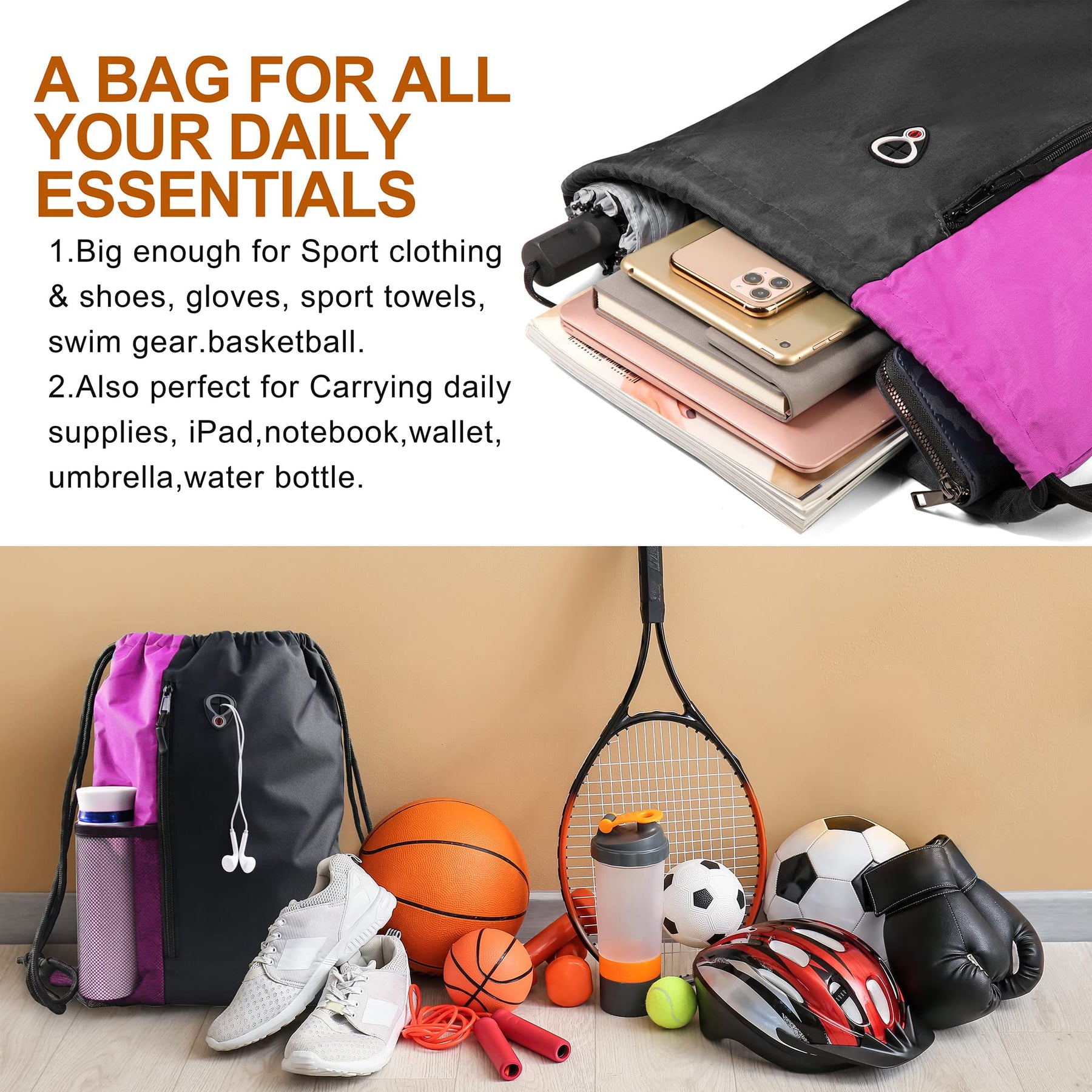 - LARGE SIZE: Our drawstring sports bag with large compartment measures 16' x 20' which is big enough for carrying a variety of items such as sports clothing & shoes, gloves, sports towels, swim gear, daily supplies.