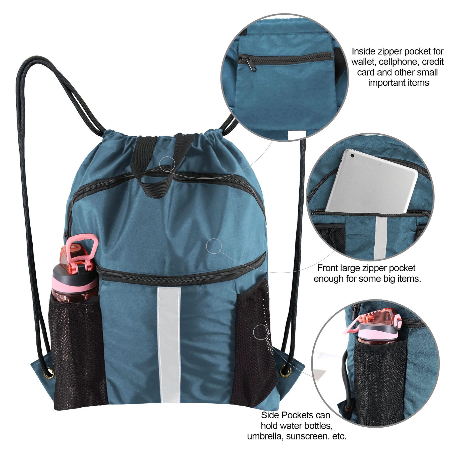 - MULTI-FUNCTIONAL POCKETS: The big shoe compartment in front of gym drawstring bag can hold two pairs of shoes; the smaller zipper front pocket is perfect for keeping an ipad, towel, and other items, besides, two sides mesh bags allow you to place a water bottle, umbrella easily. Inside of draw string bag, the zipper pocket can hold small valuables such as wallet, cellphone, keys and so on. Multiple Pockets help you to keep things to be placed by category, easy to be found.