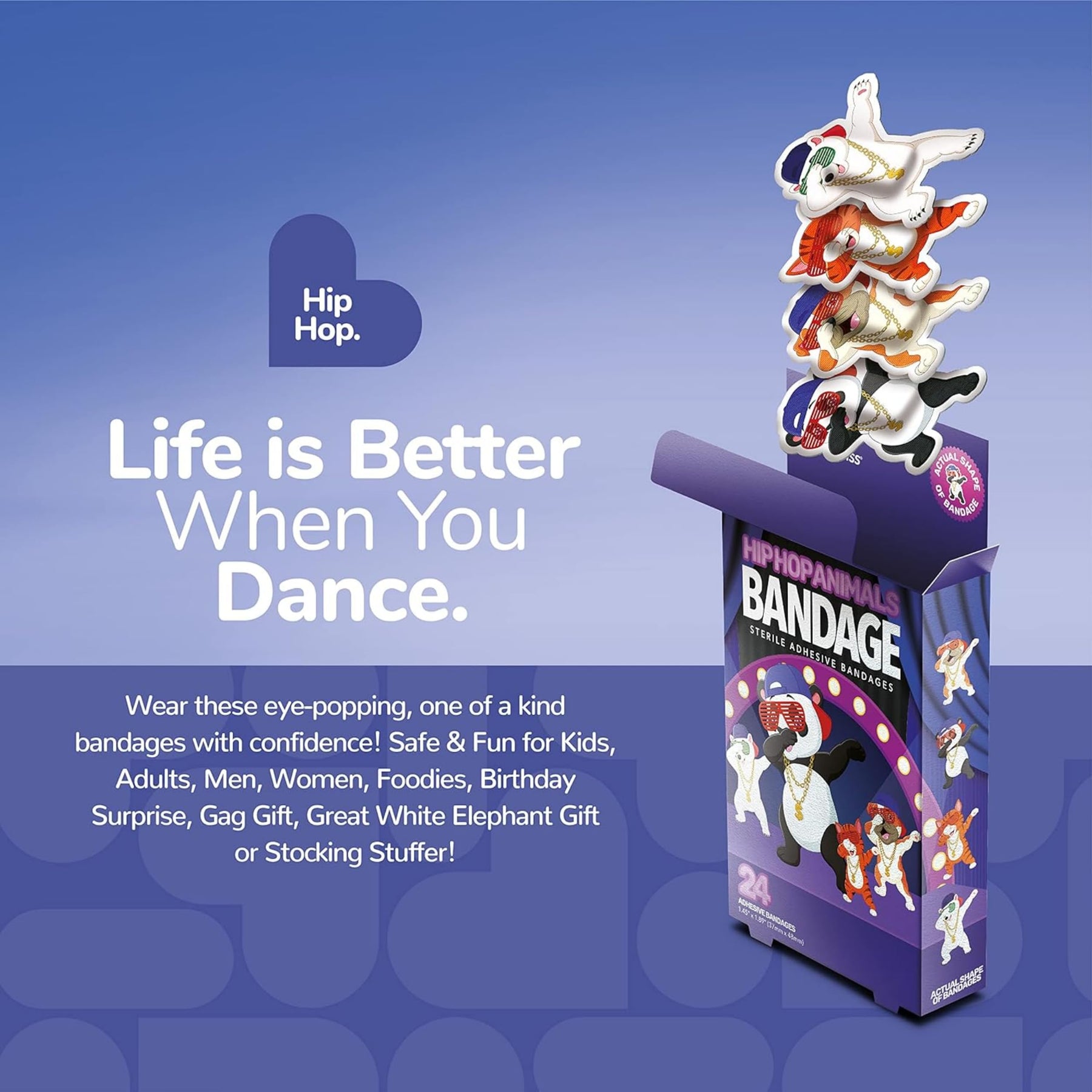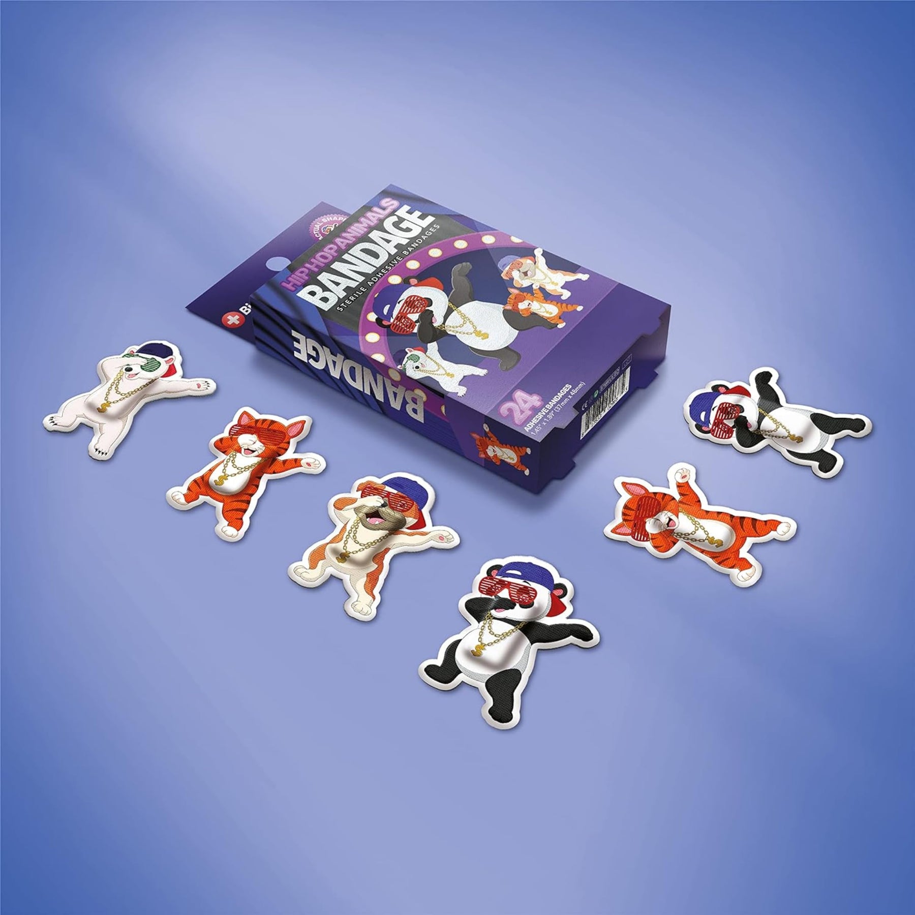 - HIP HOP ANIMALS CARTOON BANDAGES: This 24 piece pack of adorable dinosaur bandages is great for putting a smile on kids' faces while protecting wounds such as cuts, scrapes, and burns, and come in 4 assorted styles; sticky bandages are perfect for kids and adults alike, and also for school nurses and pediatric doctors