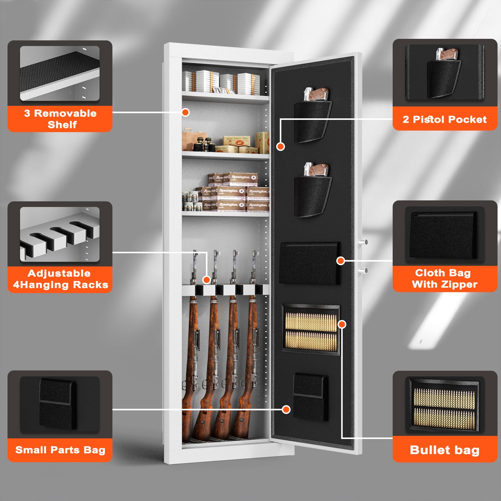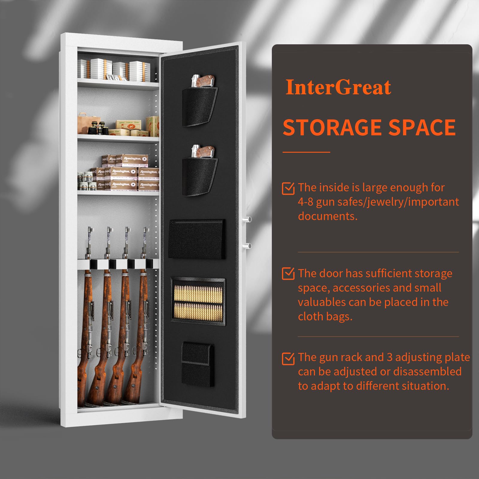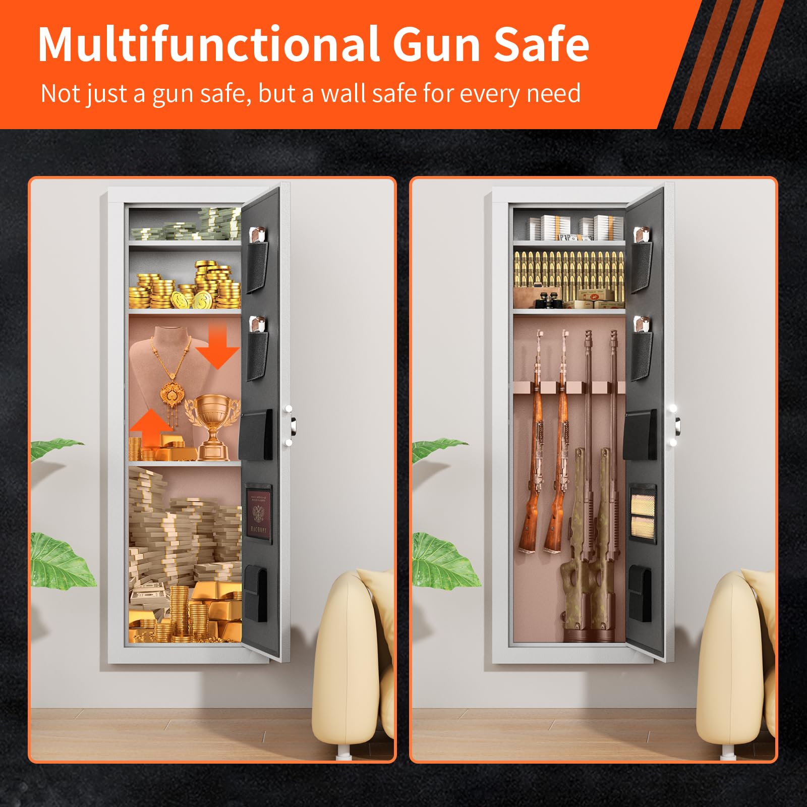 - 【HIDDEN GUN SAFE】 In wall gun safe between studs is a secret. Can fit in any room such as foyer, living room, home office, bedroom or even bathroom. This is a secret only you know. It does not take up a lot of space, the whole cabinet is in the wall, even if a burglar sneaks in, it cannot be easily found,The in wall gun safe is just the right size and easy to hide.