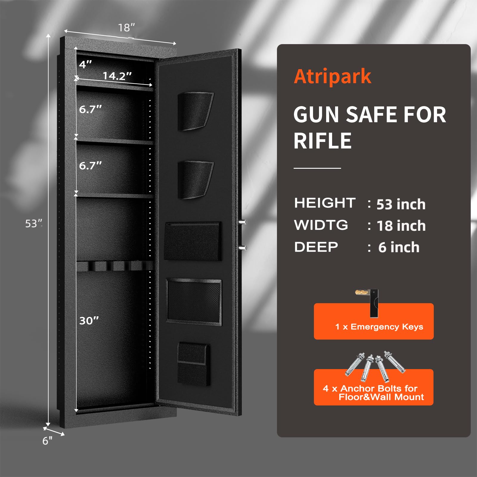 - 【THREE UNLOCKING METHODS】1. Bonusall hidden gun safe equipped with a tamper proof digital keypad lock to prevent strangers from opening it at will; 2. Fingerprint lock function, you can input the fingerprint, and then you can unlock the fingerprint3. Fireproof wall safe has one emergency keys for faster and more direct access. Powered by 4 AA batteries (not included)
