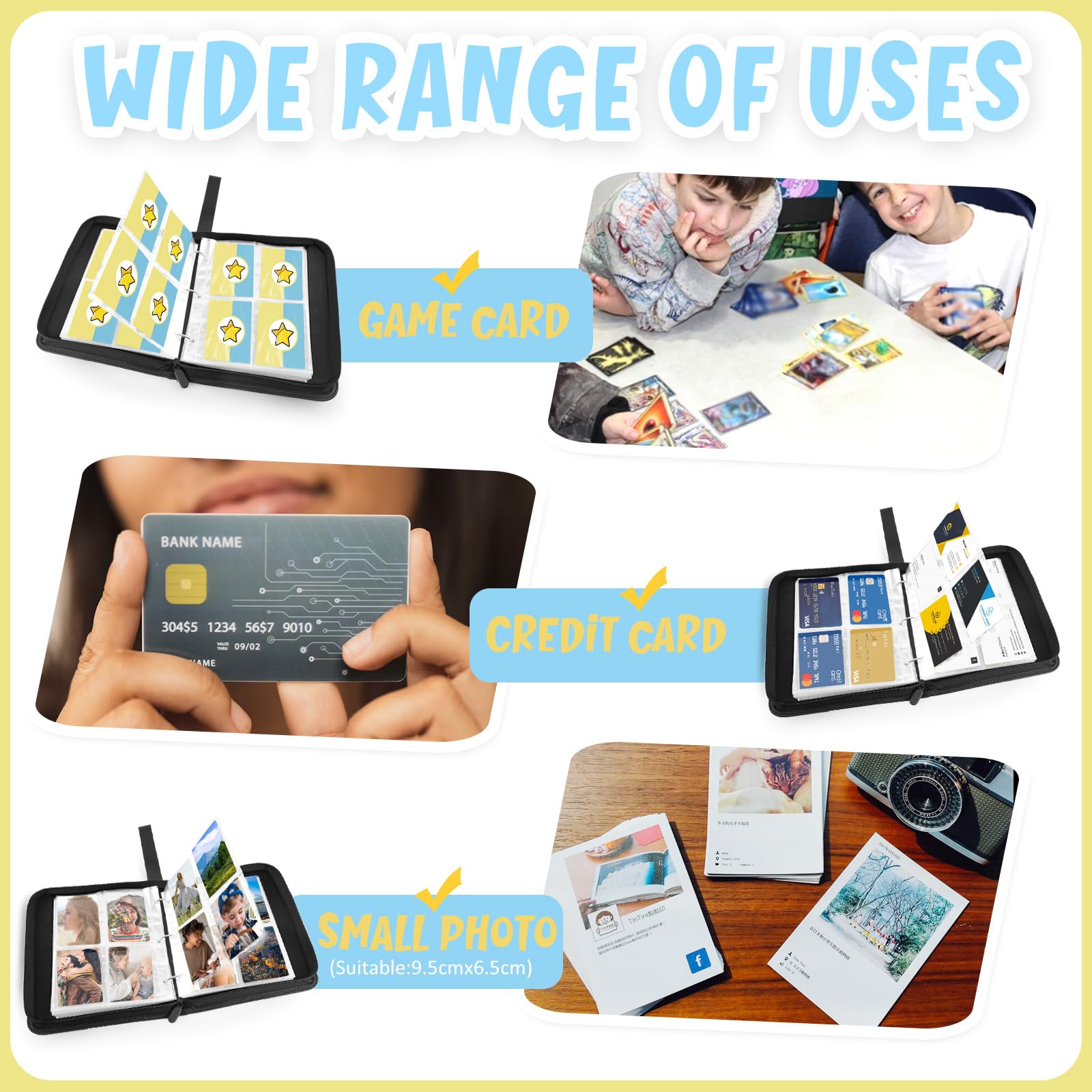 - 👍FIT FOR VARIOUS CARDS --The card binder is compatible with standard-size various cards. Examples: Football cards, Baseball cards, Playing cards, credit cards, Yu-Gi-Oh Card Games, Skylanders, WoW, MTG Card Games, Dutch Blitz Card Games, etc. Fully able to meet your needs for card collection.