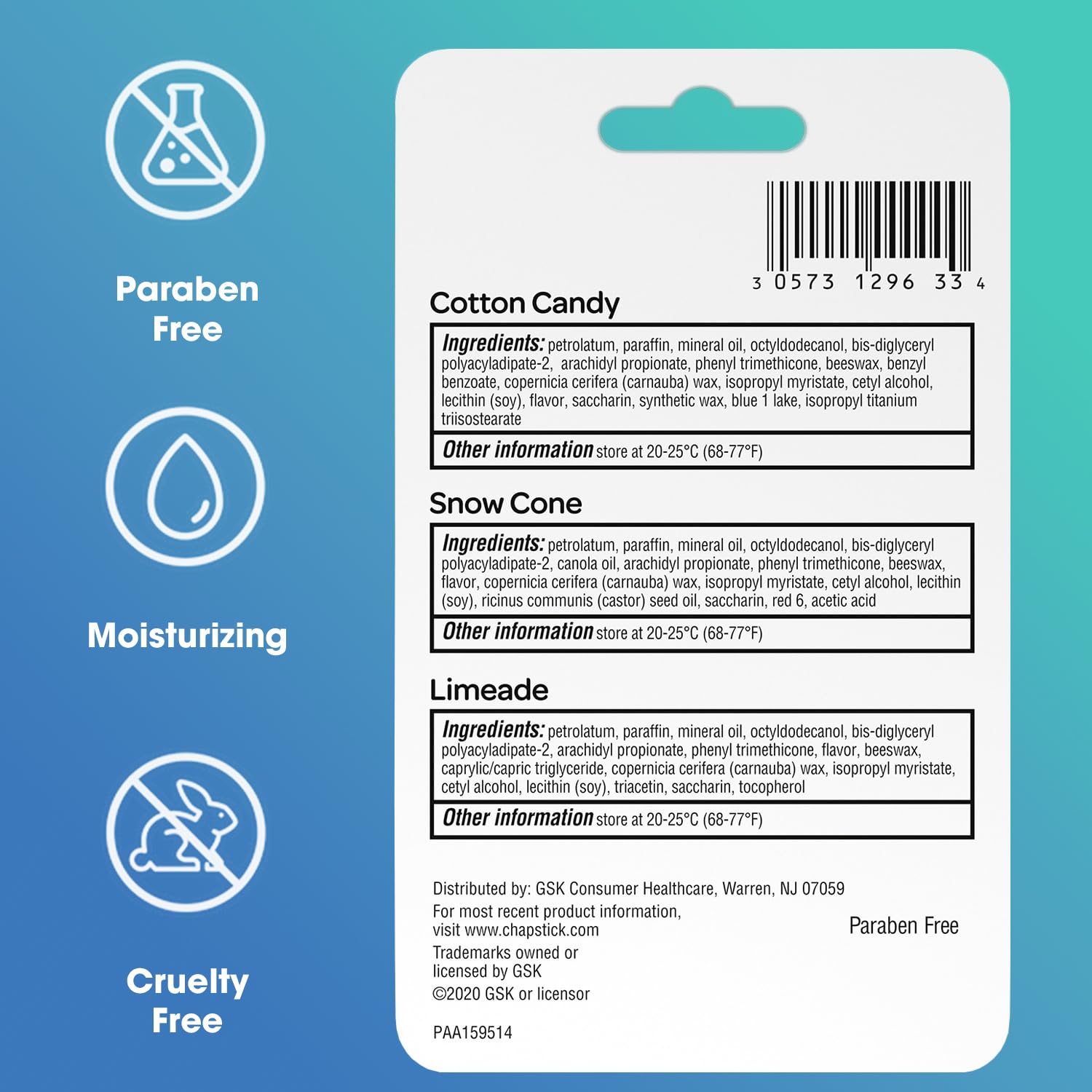• CHAPSTICK FAN FAVORITE: This collection of moisturizing lip balms includes flavors that make every day more fun: Snow Cone, Limeade, and Cotton Candy.