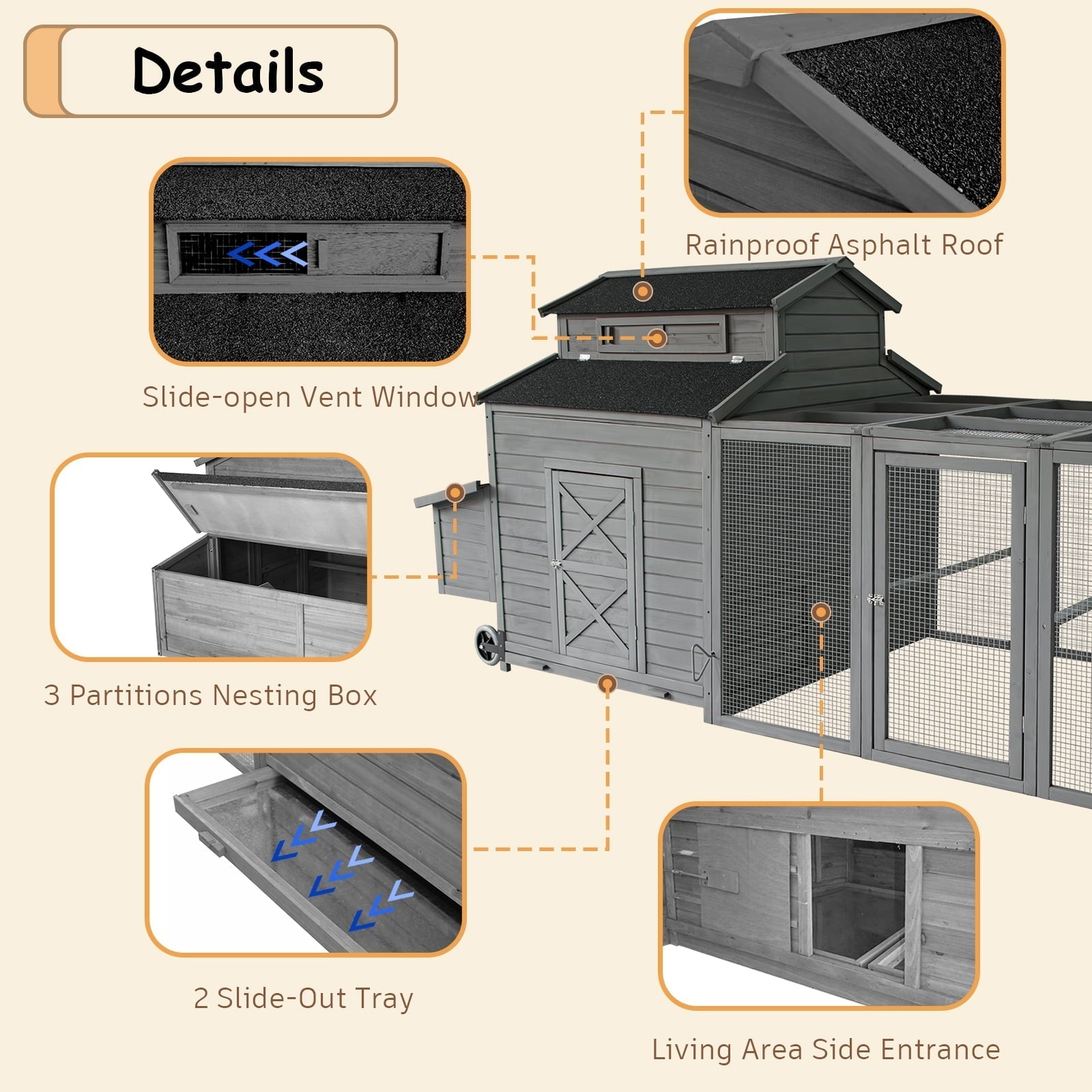 This weatherproof chicken coop is made of solid hardwood with eco-friendly paint and a green asphalt roof to keep it waterproof and sun-resistant. The extra-large 112'L x 50'W x 56'H coop provides ample space for 6-10 chickens to live comfortably, stretch, and forage. It features a 3-section nesting box for easy egg collection, a sliding tray for easy cleaning, galvanized wire fencing for predator protection, and 6 access doors. With 2 slide-on/off vent windows and 4 perches, it ensures good ventilation and comfort. The mobile design includes built-in wheels and a handle for easy relocation.