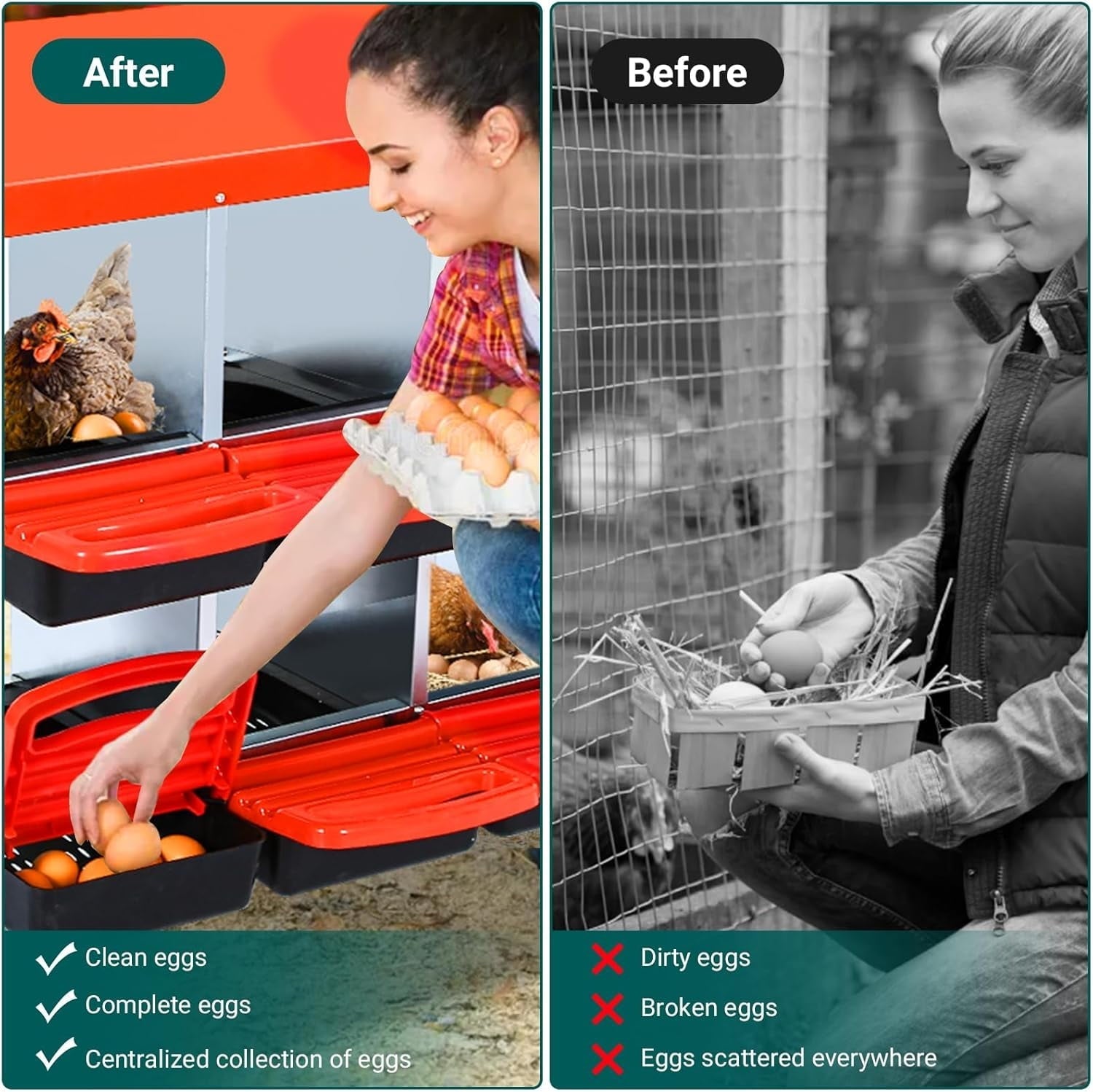 - Efficient Egg Collection System: Featuring a gentle incline, our innovative design allows eggs to roll into a conveniently accessible tray. This eliminates the need to reach into the nesting area, streamlining your egg collection routine and ensuring a clean, hassle-free harvesting experience.