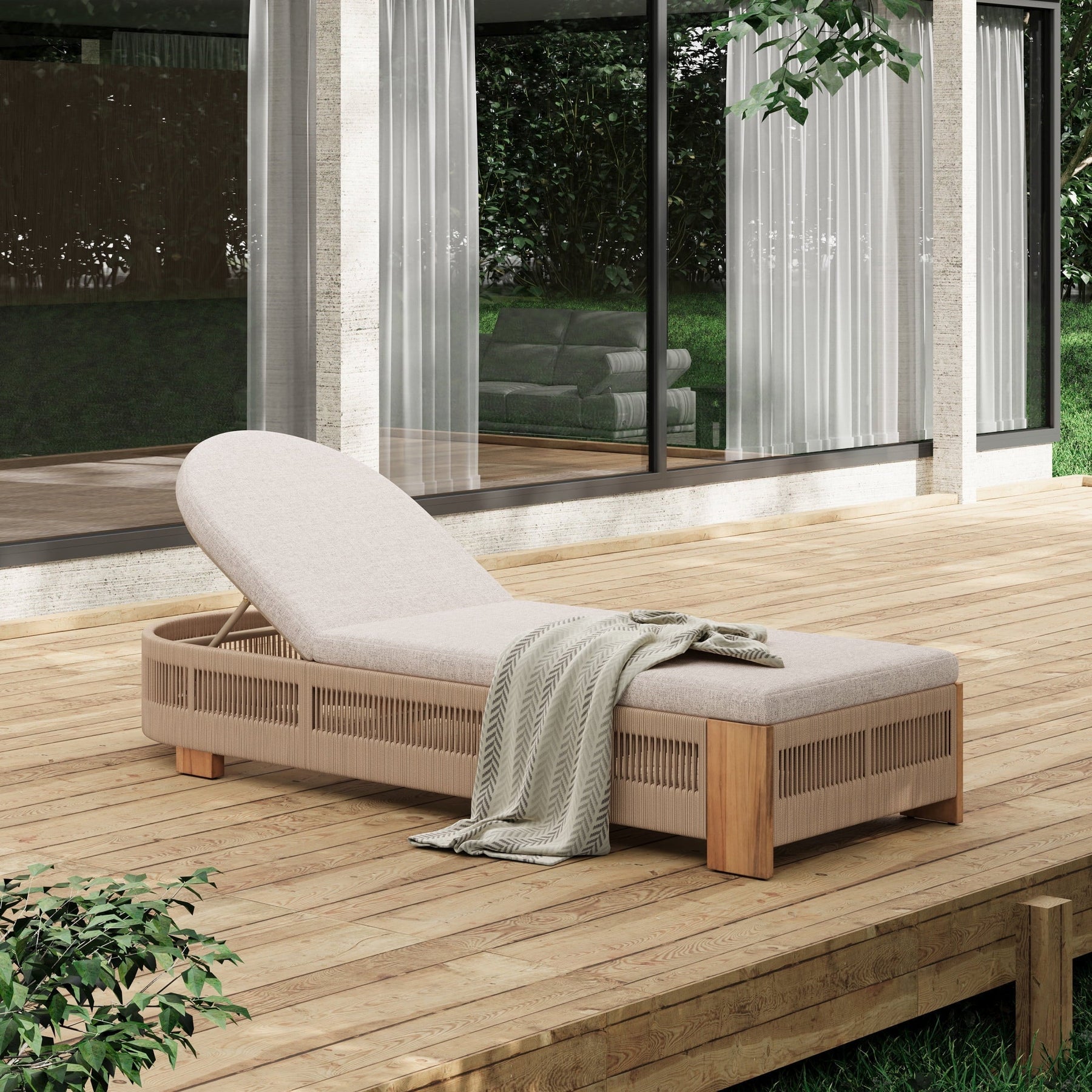 Transform your patio or poolside into a serene retreat with this elegant Outdoor Chaise Lounge Set featuring a teak-look acacia wood frame, beige rope detailing, and natural iron accents. The adjustable backrest offers five reclining positions, allowing you to find the perfect angle for reading, sunbathing, or relaxing. Crafted from durable acacia wood, this chaise is naturally resistant to decay and outdoor wear. The included beige cushion is filled with high-density foam and polyester fiber batting for plush, supportive comfort. Its water-repellent fabric resists moisture and is easy to clean—ideal for all-season outdoor lounging. The combination of rustic texture and modern functionality makes this set a stylish and practical addition to gardens, balconies, or pool decks.