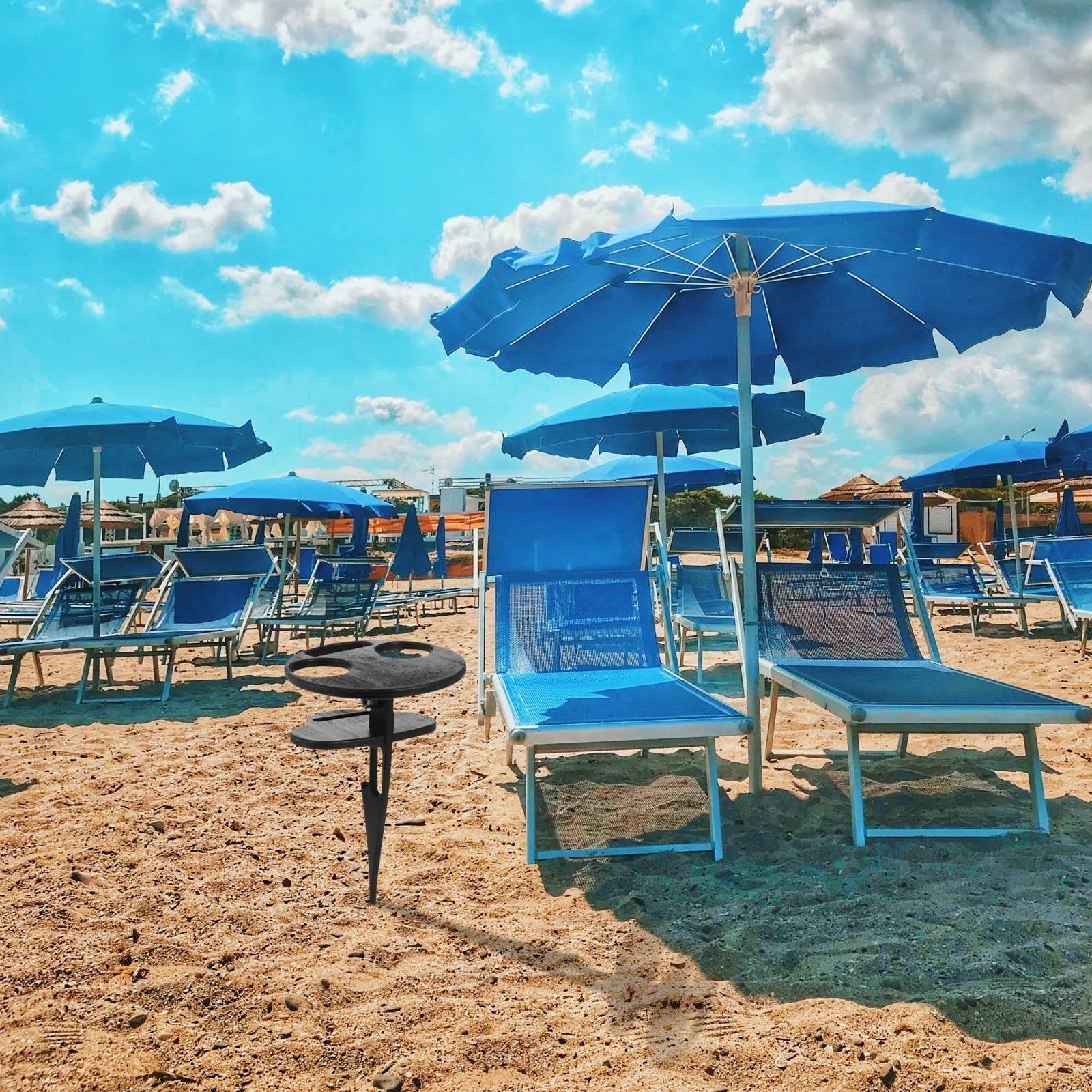 - It can be pushed into the ground with little effort It works in grass, dirt and sand -portable small outdoor table