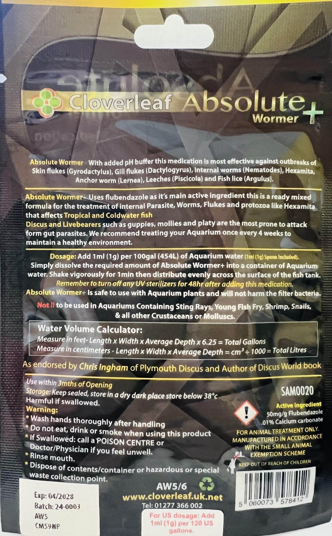 Absolute Wormer Plus is a trusted, Flubendazole-based medication that effectively treats a wide range of aquarium and pond parasites, including Gill Flukes, Body Flukes, Tapeworm, Nematodes, Planaria, and Protozoa. Its formula is specially crafted to be safe for use on most tropical and saltwater fish, without harming plants or chemical filtration. The addition of natural Calcium Carbonate helps to gently balance the pH, making it a versatile and reliable solution for maintaining a healthy aquarium or pond environment. This product can be used in conjunction with other medications and does not require the removal of UV sterilizers or activated carbon.