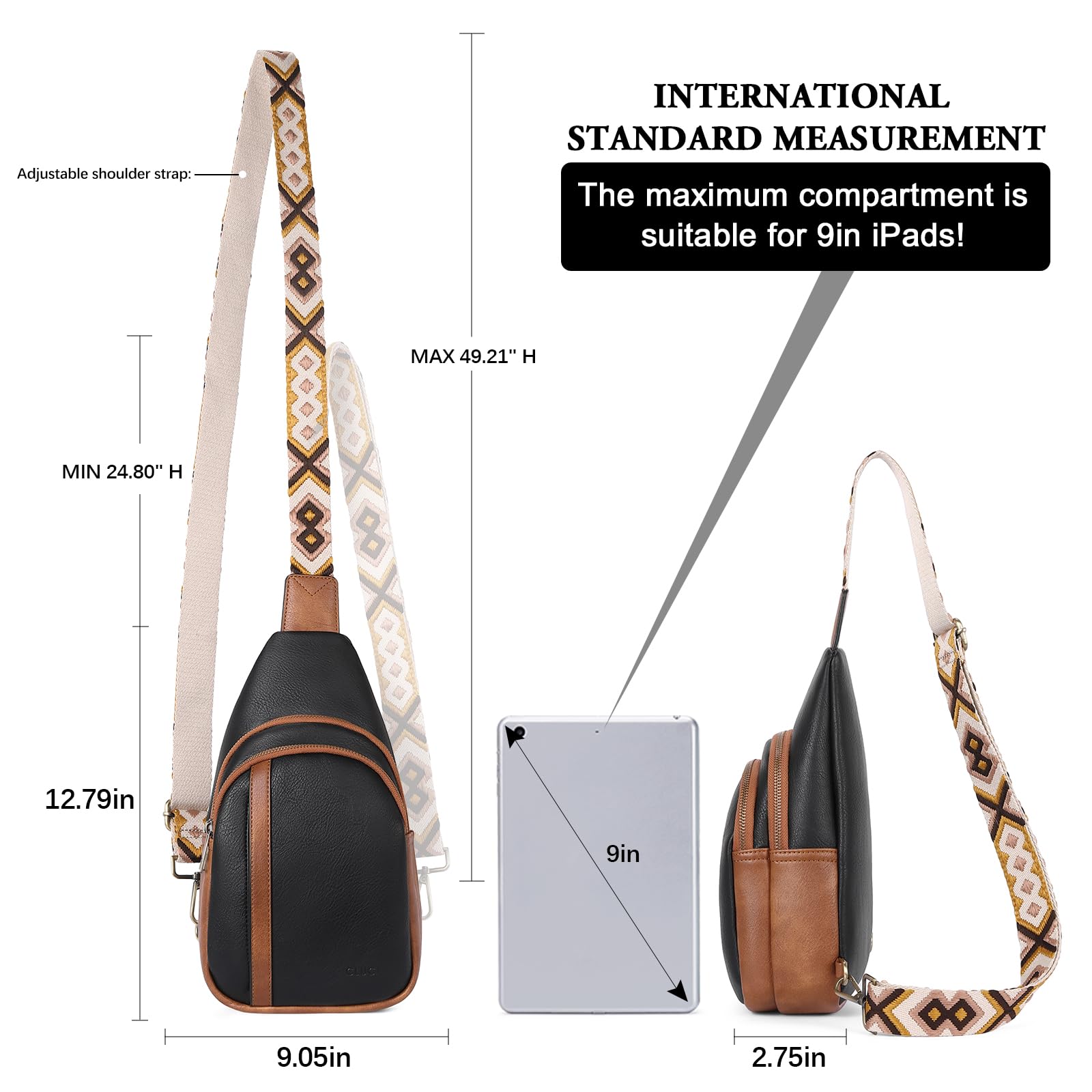 - 【Perfect Size】SIZE: 9.05' * 2.75'' * 12.79'', WEIGHT: 0.81lbs.The cross body bags can be used as sling backpack, crossbody bag, chest bag and shoulder bags, making it lightweight and convenient to carry. This crossbody sling bag for women has adjustable colorful strap that can be adjusted to your needs. The adjustable strap length is 24.40 to 45.66 inches.
