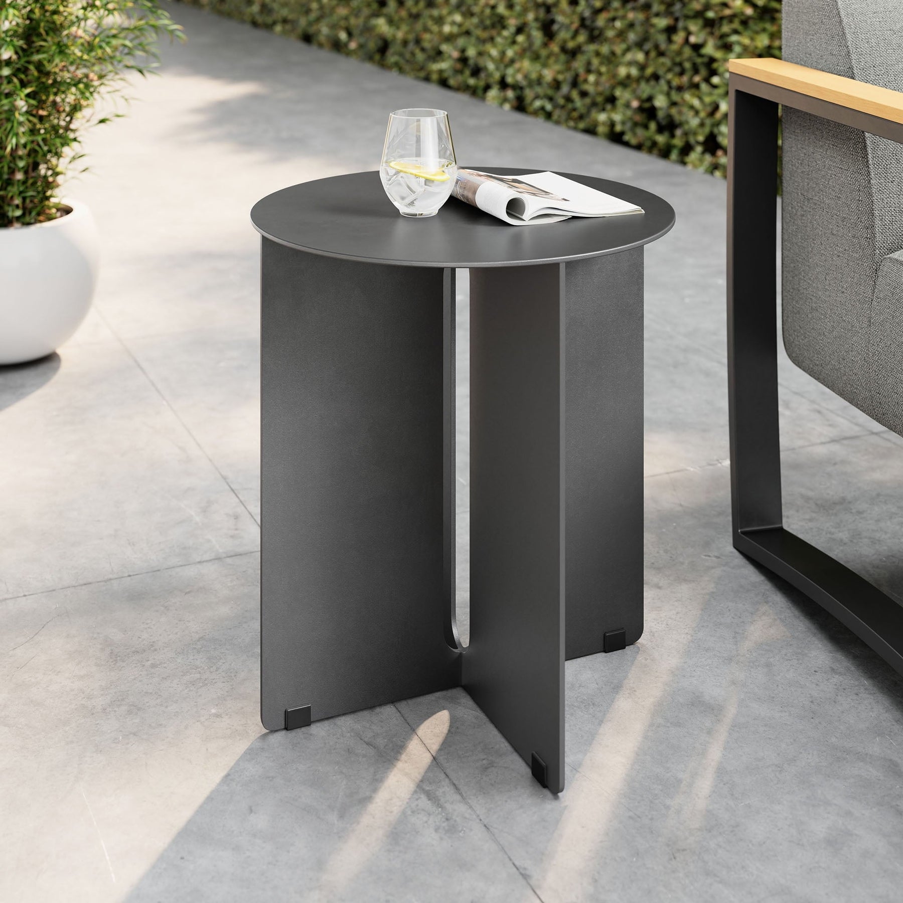 Clean minimalist design and sleek modern lines come together in the Tecton Aluminum Outdoor Patio Side Table. Crafted with a powder-coated aluminum top and base for a durable, weather-resistant finish, this metal patio side table showcases geometric precision and compact, sculptural quality. The intersecting base, featuring a central thin cut-out where the panels meet, creates a captivating visual flow, making the outdoor end table appear lighter and more modern. With a round table top and smooth edges, this metal outdoor side table features a simple aesthetic and is sturdy enough to support an afternoon drink, books, or potted plants. Ideal as a chic pool side table, a front porch table or an outdoor garden table, Tecton comes equipped with plastic glides to protect your outdoor flooring. Arriving fully assembled, this 15 inch all-around small accent patio table is perfect for enhancing gardens, patios, or poolside lounging with its stylish modernity. Weight Capacity: 56 lbs.