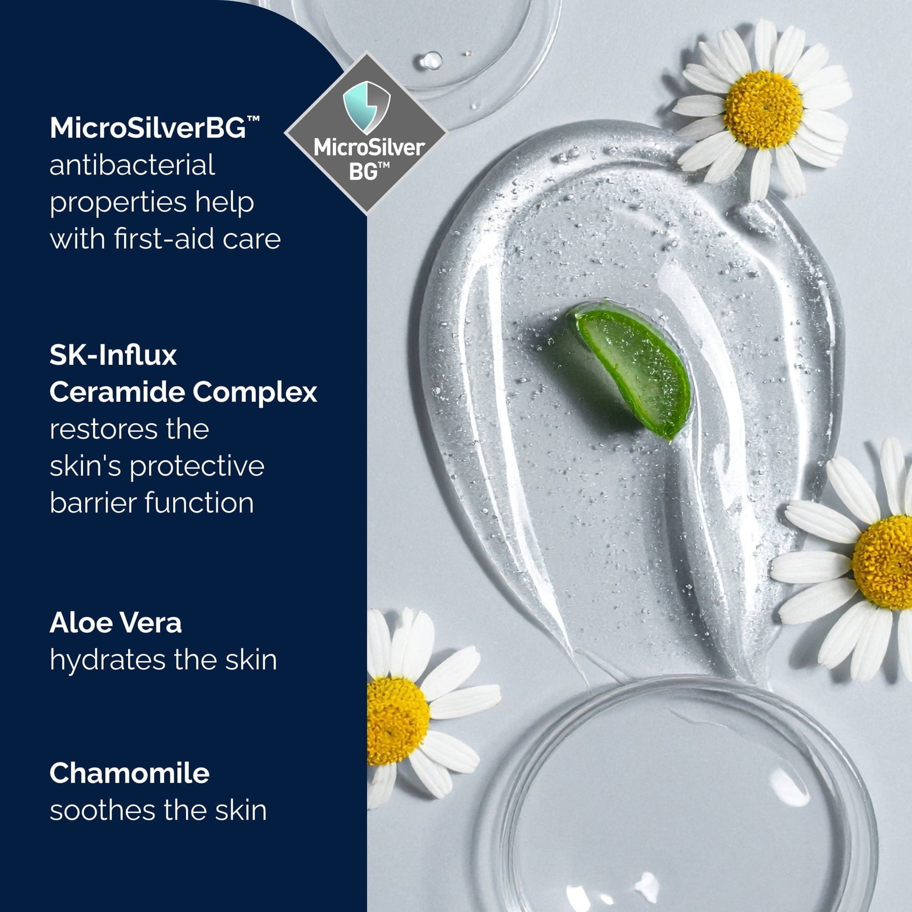 - Silver for Skin Recovery: Tiny MicroSilver BG™ particles apply to affected areas to provide first-aid care to minor scrapes, cuts, and abrasions.