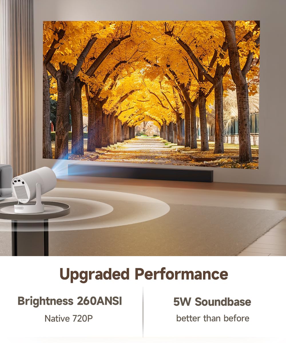 - Immersive Audio-Visual Experience: Experience 720P resolution with 4K compatibility, 260 ANSI lumens brightness, and a dynamic 8000:1 contrast ratio. Enhanced by an integrated 5W Soundbase Speaker, this smart projector elevates both sound and visuals, making it suitable for casual movie nights, family entertainment in bedrooms, or outdoor gatherings.