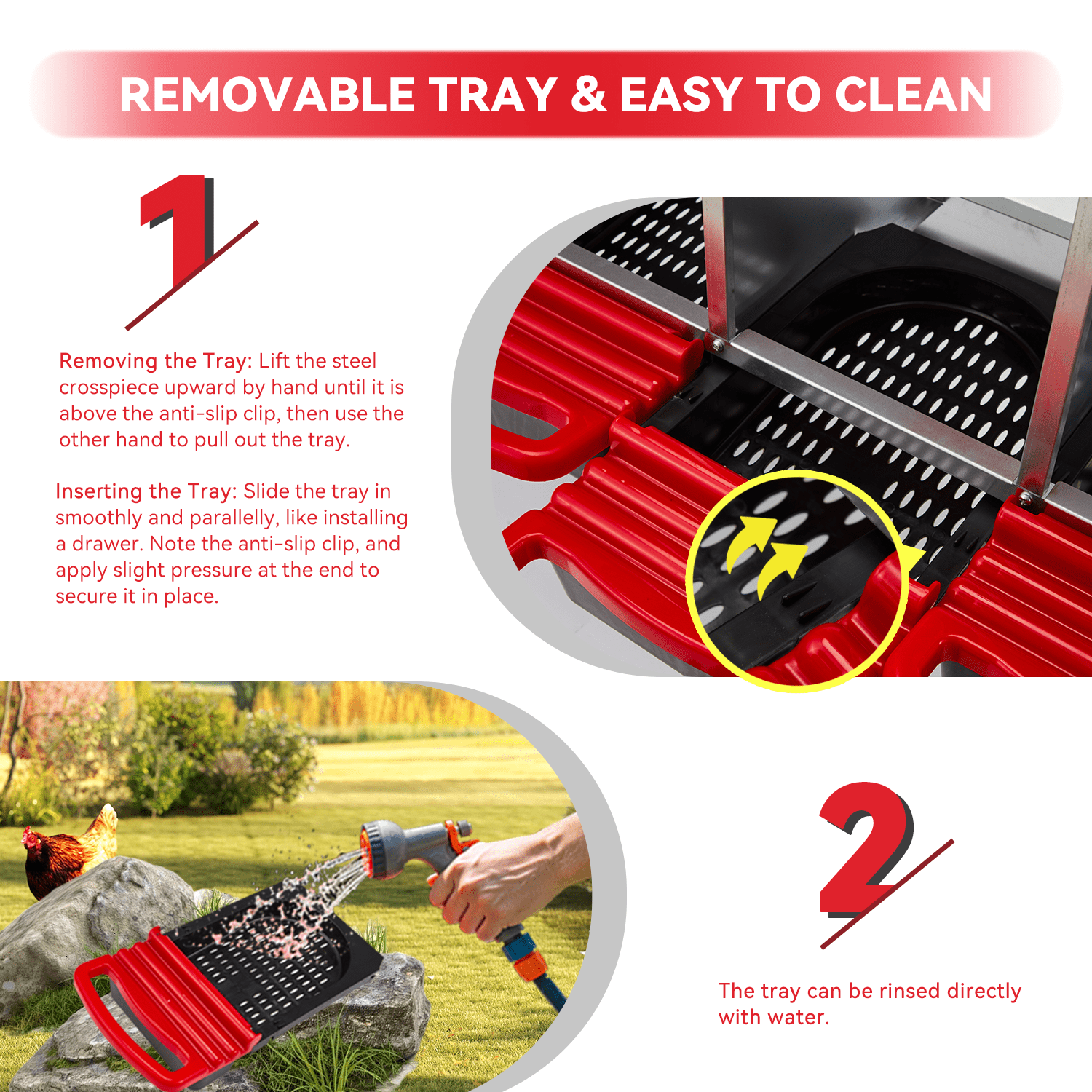 • Simple Cleaning and Maintenance: Removable plastic trays with built-in drainage holes make cleanup a breeze. Mesh bottoms let waste fall through, while flip-up perches and removable dividers give you full access for deeper cleaning when needed