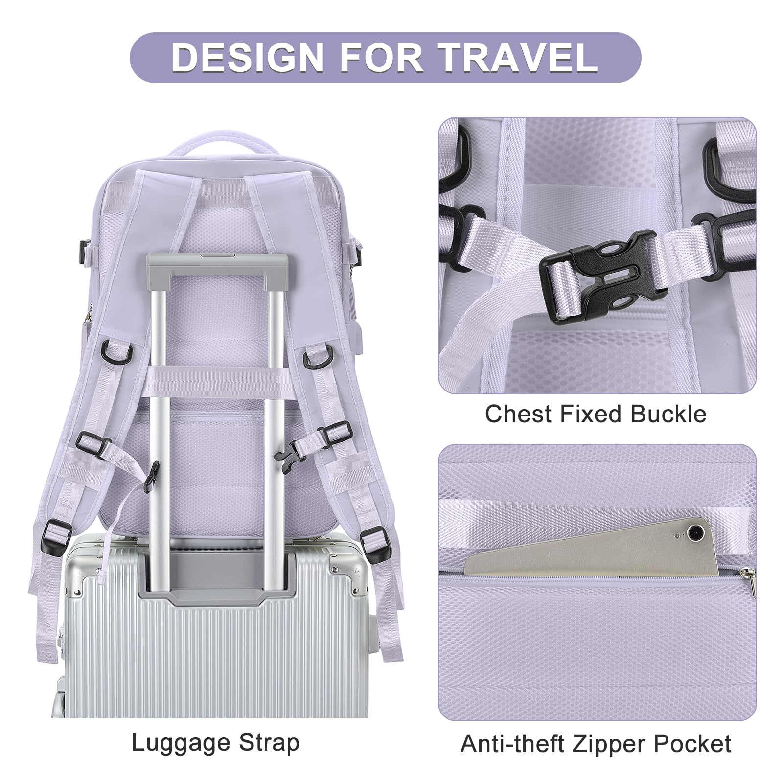 - 【Comfort and Safety】 Comfortable airflow back design, thick and soft multi-panel ventilated padding provides back support. Breathable, adjustable shoulder straps and a chest buckle to relieve shoulder pressure. This backpack can be slipped on the trolley of the suitcase to make traveling easier. Hidden anti-theft zipper pocket on the back of the backpack to prevent your valuables from being stolen.