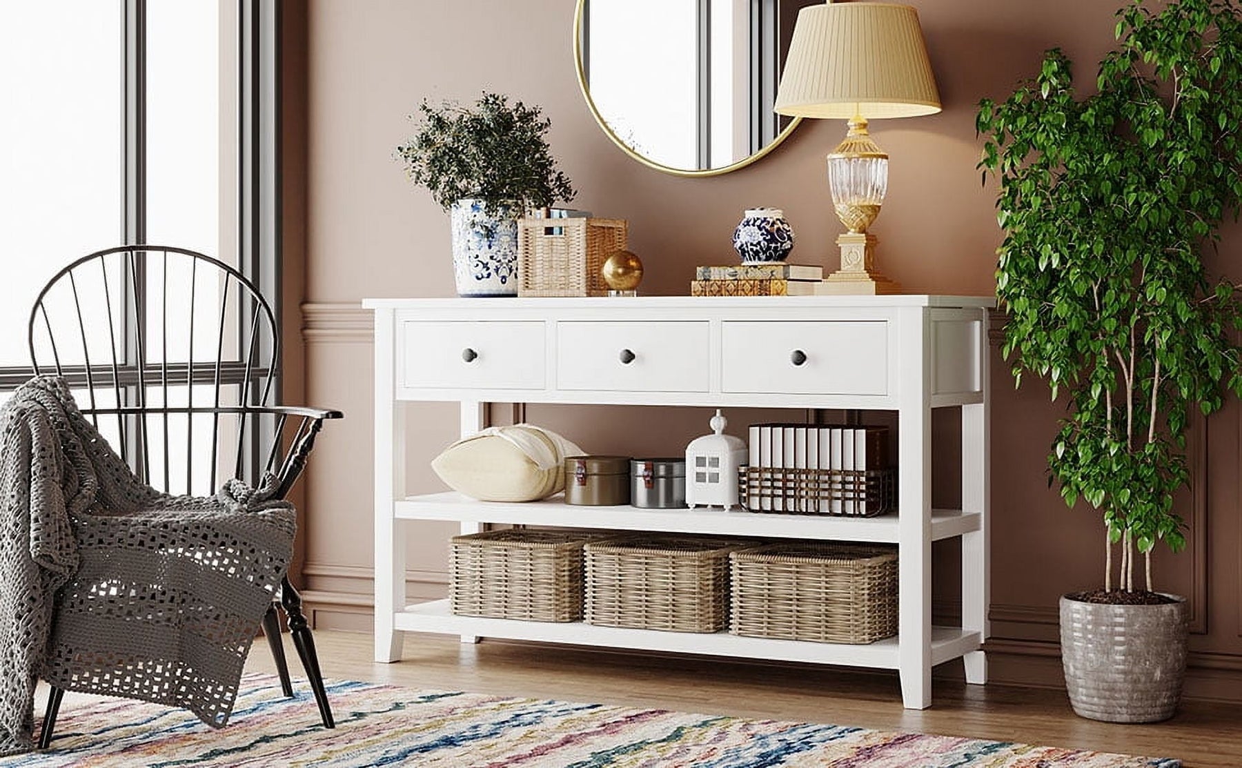 This Retro Design Console Table blends mid-century style with modern functionality. Perfect for the living room, this table features a solid pine wood frame and legs, offering durability and stability. With three drawers and two open shelves, it provides ample storage for daily necessities, ensuring a clean and organized space. The antique white finish complements any decor, making it a versatile addition to any home. Classic design with clean lines and circular handles, adding a retro touch to your home.