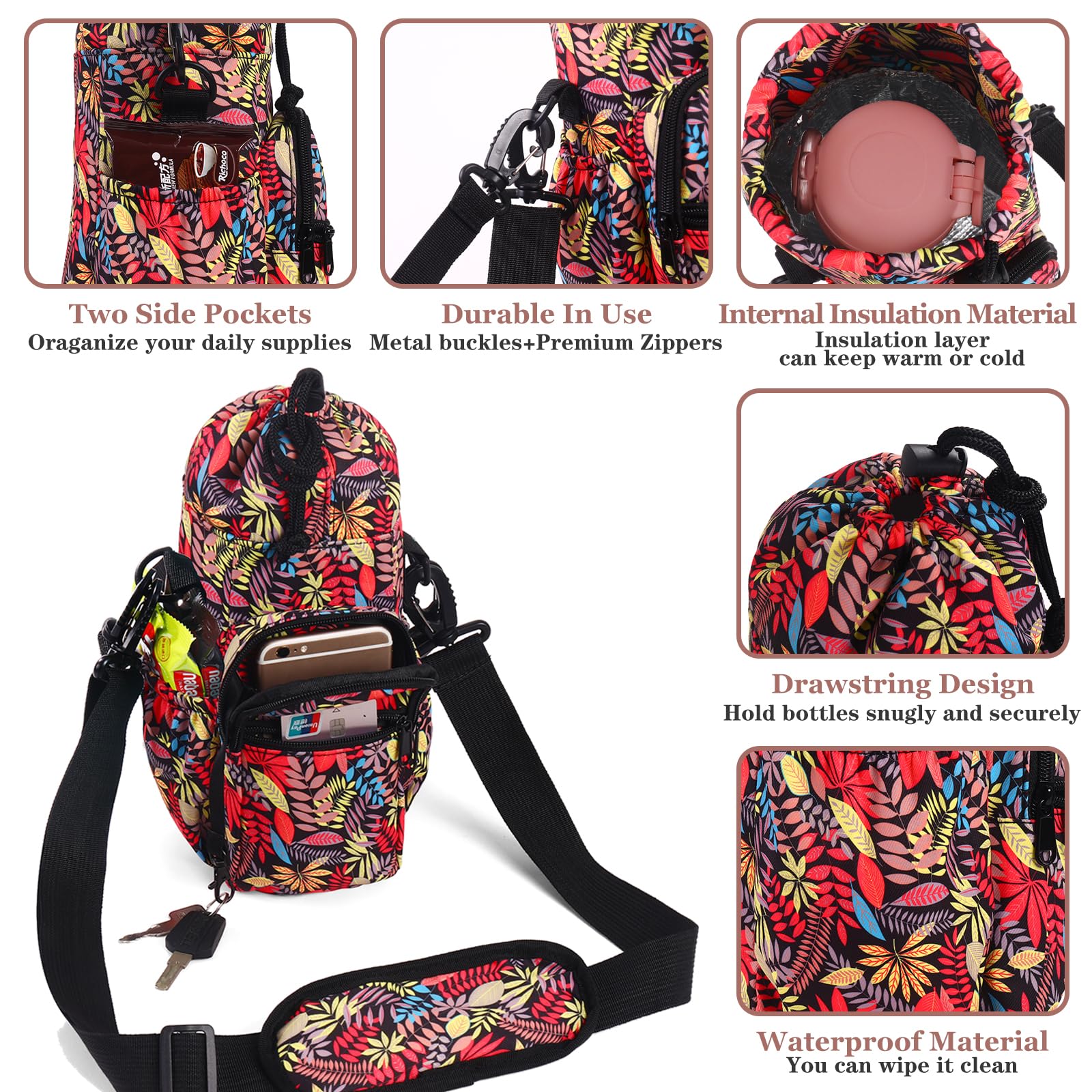 FCQQYWZ Water Bottle Holder with Strap, 32/40oz Water Bottle Bag Crossbody Insulation Water Bottle Holder with Adjustable Shoulder Strap, 4 Pockets for Walking,Camping,Hikingand Fishing (Leaf)