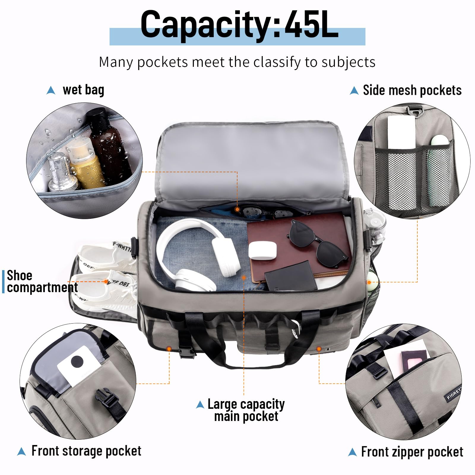 - Dry & Wet Separated: The duffle bag has a waterproof wet pocket in the main compartment which can contain your wet towels. In additon, equipped with a shoe compartment, it can keep dirty shoes away from clean clothes